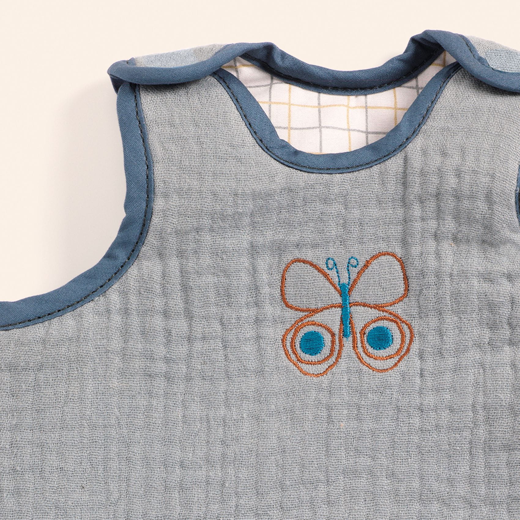 Śliczny, szary śpiworek z wyhaftowanym motylkiem, by bobas w postaci