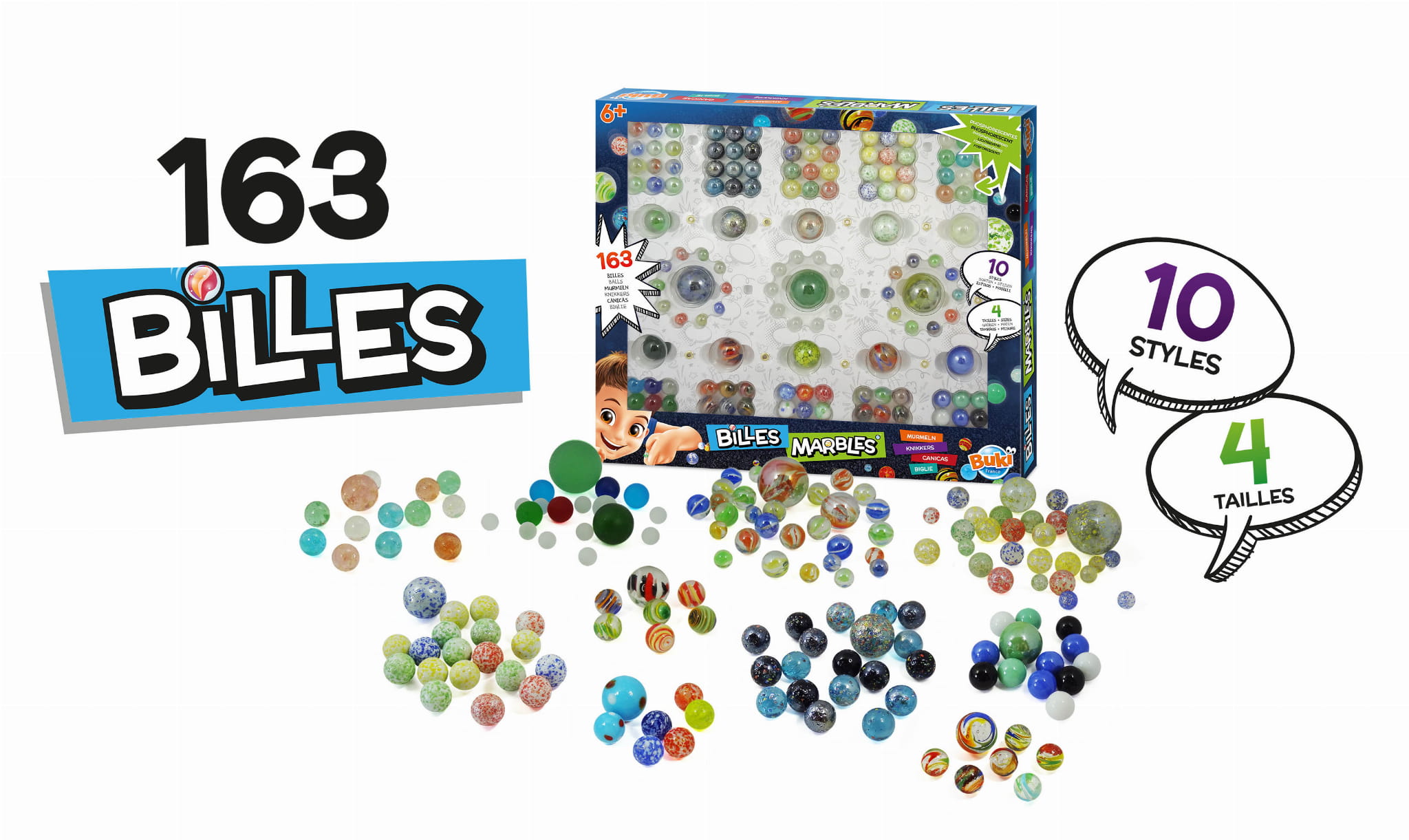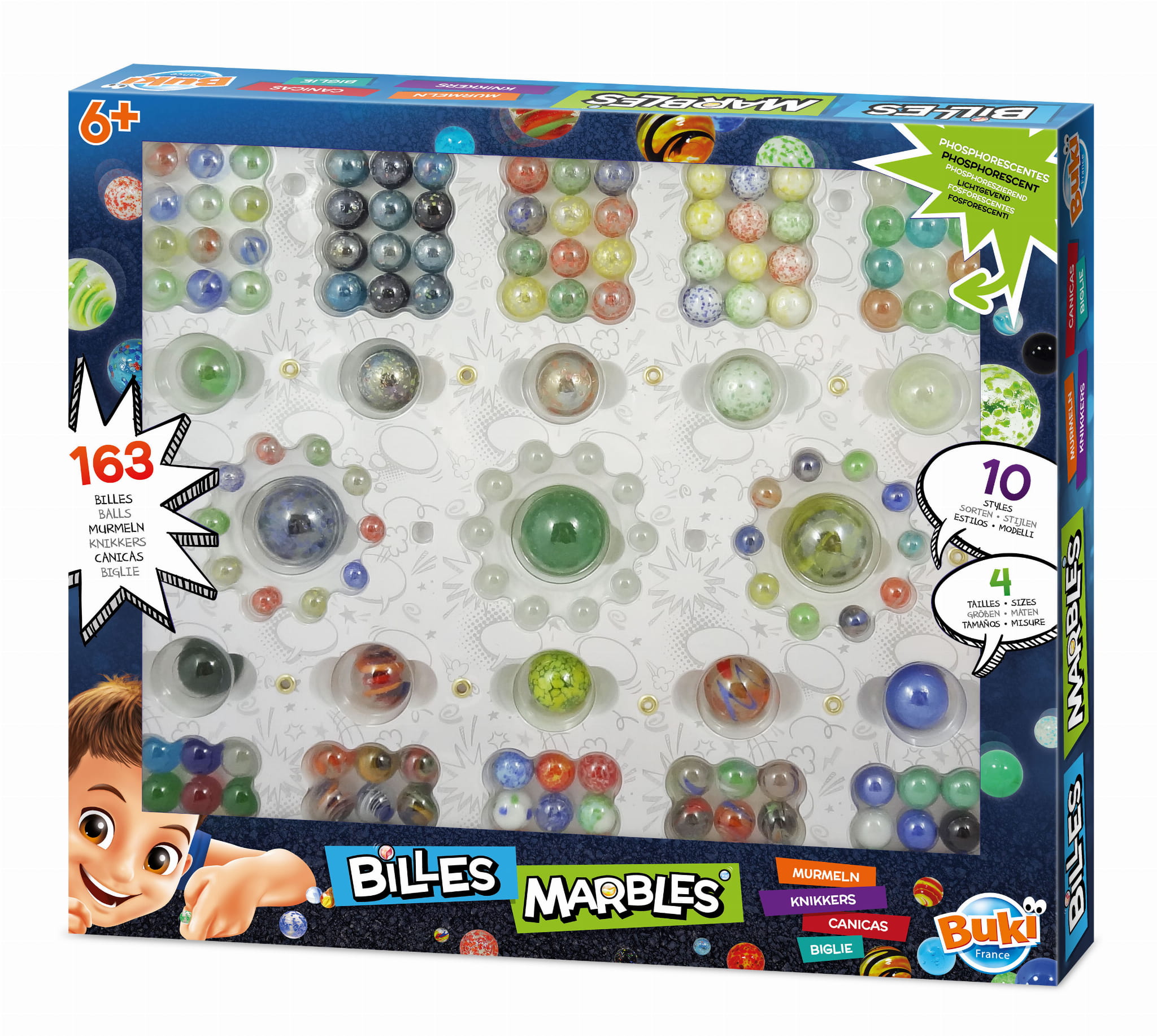 Zestaw 163 szklanych kulek w 4 rozmiarach i 10 różnych stylach kolorystycznych. Część kulek świeci w ciemności.