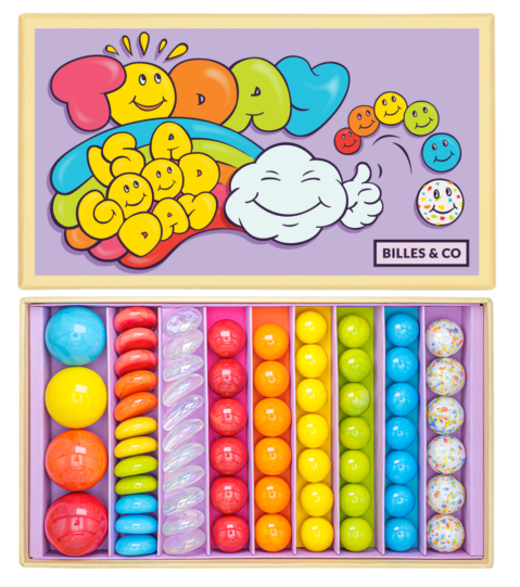 Billes&Co DOBRY DZIEŃ to zestaw 67 szklanych kulek i kamyczków, kolorystycznie ułożonych w pięknie zdobionym pudełku. Przeróżne barwy, tekstury i wzory kulek posiadają hipnotyzującą moc, która nie pozwoli oderwać się od zabawy. Kulki są ułożone tematycznie, tworząc w małych pudełeczkach swoiste uniwersa.