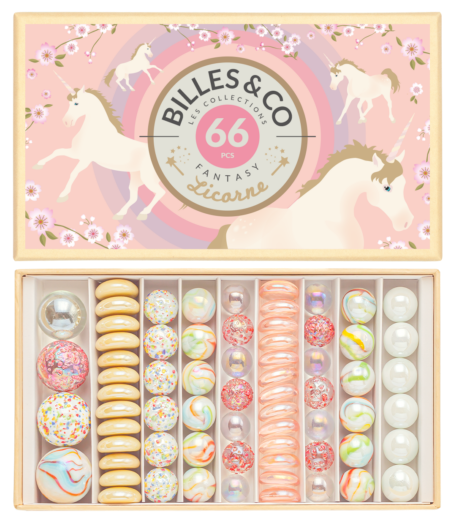 Billes&Co JEDNOROŻCE to zestaw 66 szklanych kulek i kamyczków, kolorystycznie ułożonych w pięknie zdobionym pudełku. Przeróżne barwy, tekstury i wzory kulek posiadają hipnotyzującą moc, która nie pozwoli oderwać się od zabawy. Kulki są ułożone tematycznie, tworząc w małych pudełeczkach swoiste uniwersa.