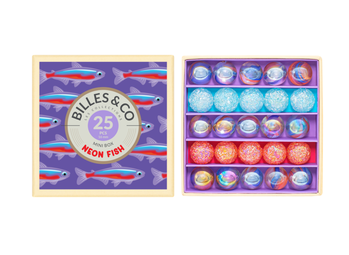 Billes&Co RYBKI to zestaw 25 szklanych kulek i kamyczków, kolorystycznie ułożonych w pięknie zdobionym pudełku. Przeróżne barwy, tekstury i wzory kulek posiadają hipnotyzującą moc, która nie pozwoli oderwać się od zabawy. Kulki są ułożone tematycznie, tworząc w małych pudełeczkach swoiste uniwersa.