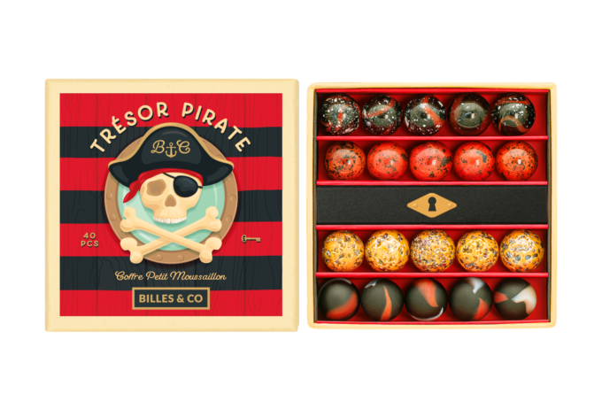 Billes&Co SKARB PIRATÓW to zestaw 40 szklanych kulek i kamyczków, kolorystycznie ułożonych w pięknie zdobionym pudełku. Powstał we współpracy z marką Babyatoutprix. Przeróżne barwy, tekstury i wzory kulek posiadają hipnotyzującą moc, która nie pozwoli oderwać się od zabawy. Kulki są ułożone tematycznie, tworząc w małych pudełeczkach swoiste uniwersa.