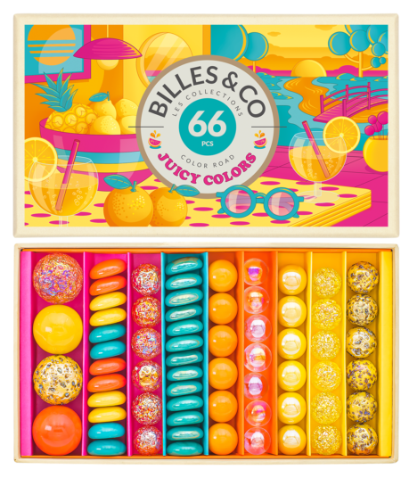 Billes&Co SOCZYSTE KOLORY to zestaw 66 szklanych kulek i kamyczków, kolorystycznie ułożonych w pięknie zdobionym pudełku. Przeróżne barwy, tekstury i wzory kulek posiadają hipnotyzującą moc, która nie pozwoli oderwać się od zabawy. Kulki są ułożone tematycznie, tworząc w małych pudełeczkach swoiste uniwersa.