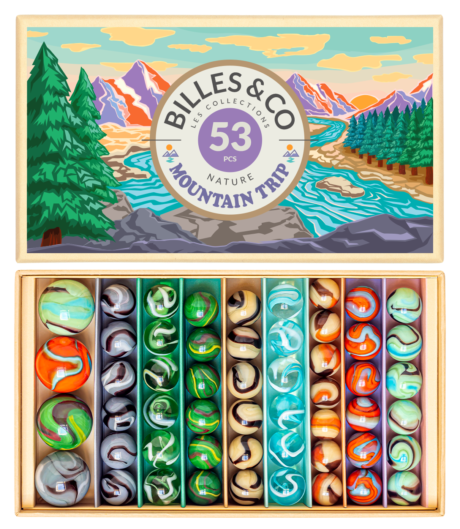 Billes&Co WYPRAWA W GÓRY to zestaw 53 szklanych kulek i kamyczków, kolorystycznie ułożonych w pięknie zdobionym pudełku. Przeróżne barwy, tekstury i wzory kulek posiadają hipnotyzującą moc, która nie pozwoli oderwać się od zabawy. Kulki są ułożone tematycznie, tworząc w małych pudełeczkach swoiste uniwersa.