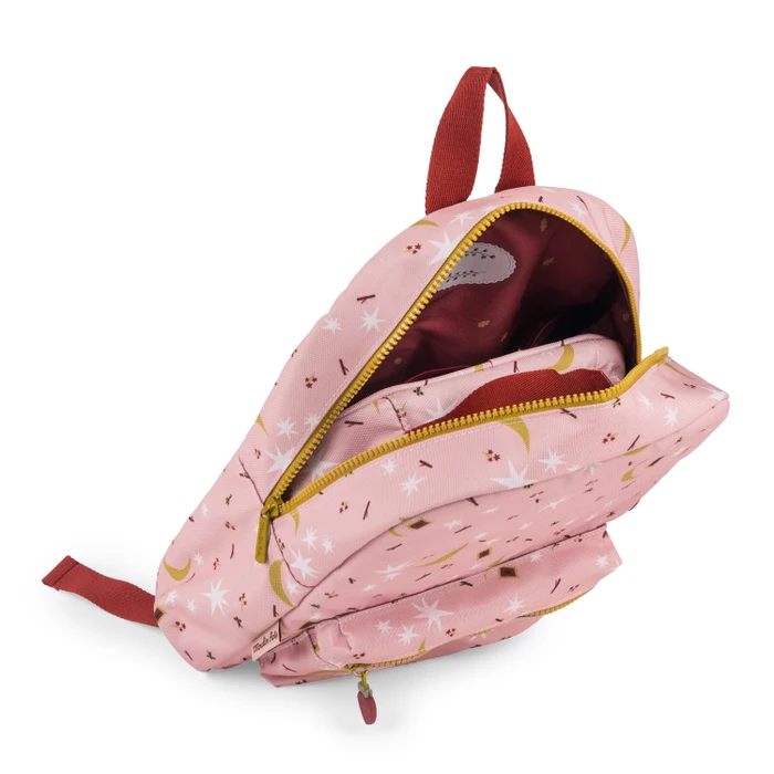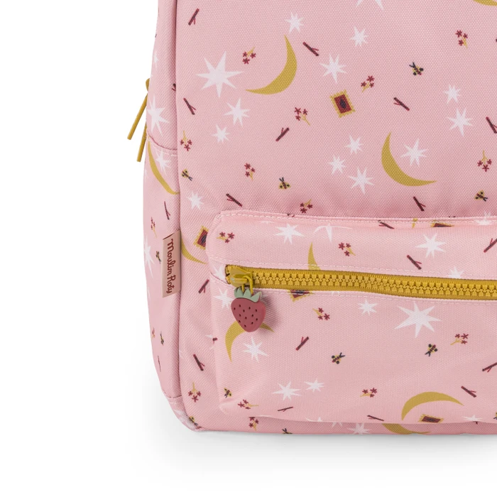 Szkolny plecak w kolorze bladego różu w drobny wzór pochodzący z kolekcji Apres La Pluie. Z przodu posiada kieszonkę na zamek zwieńczony uroczą zawieszką w kształcie truskawki. W środku znajduje się dodatkowa przegródka. Z boku znajduje się siateczkowa kieszeń np. na bidon. Komora główna pomieści format A4.