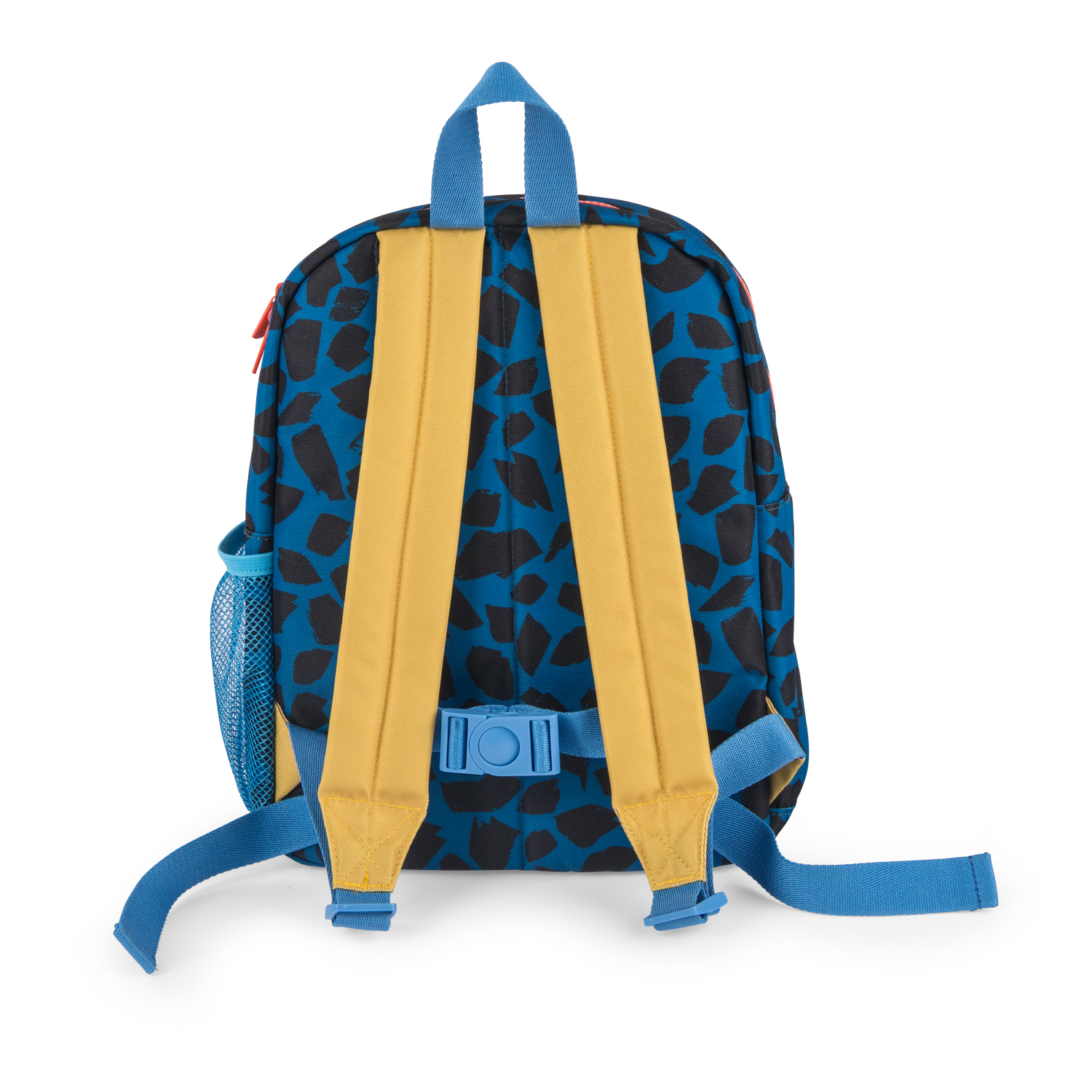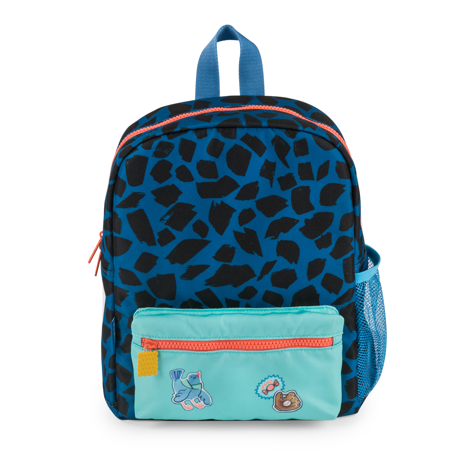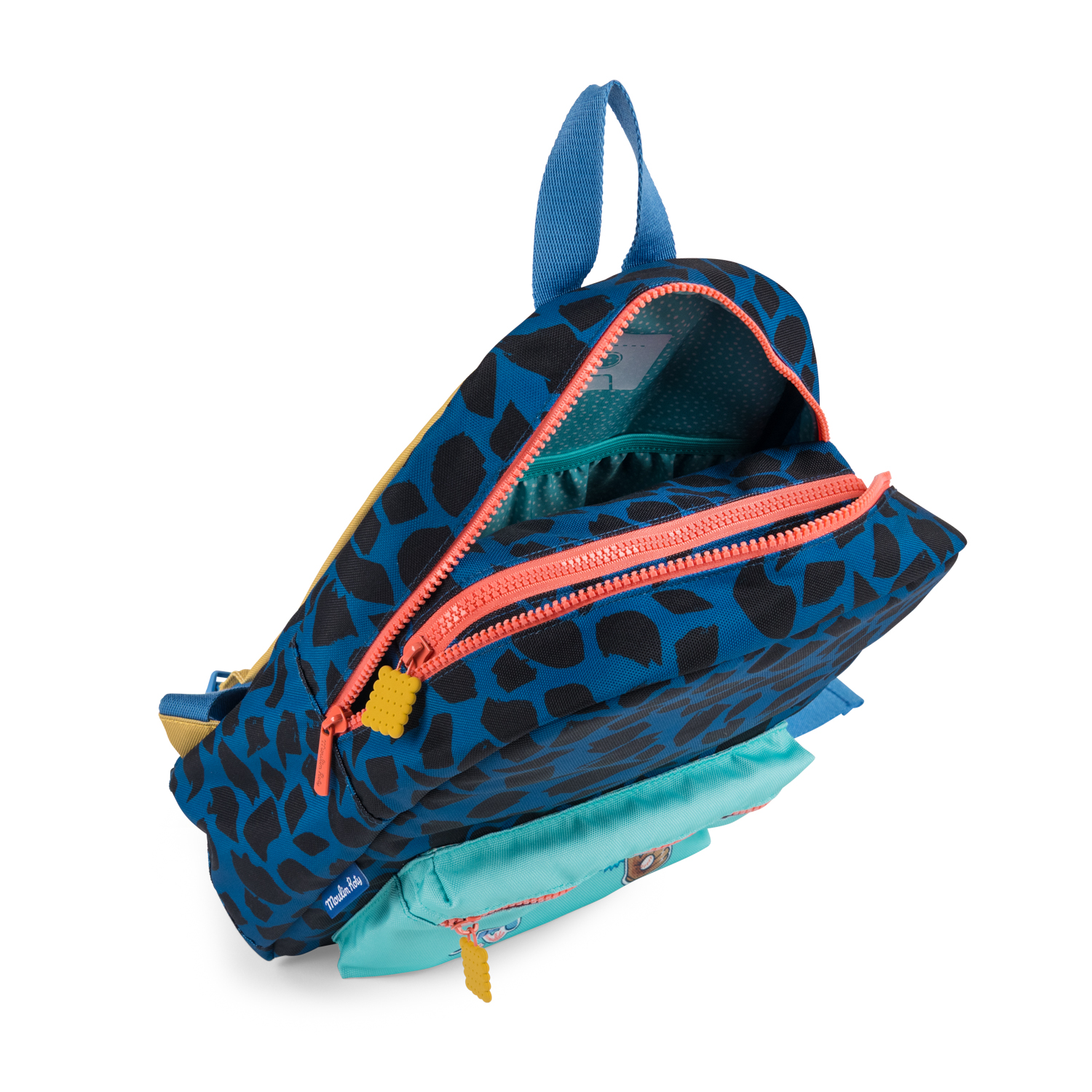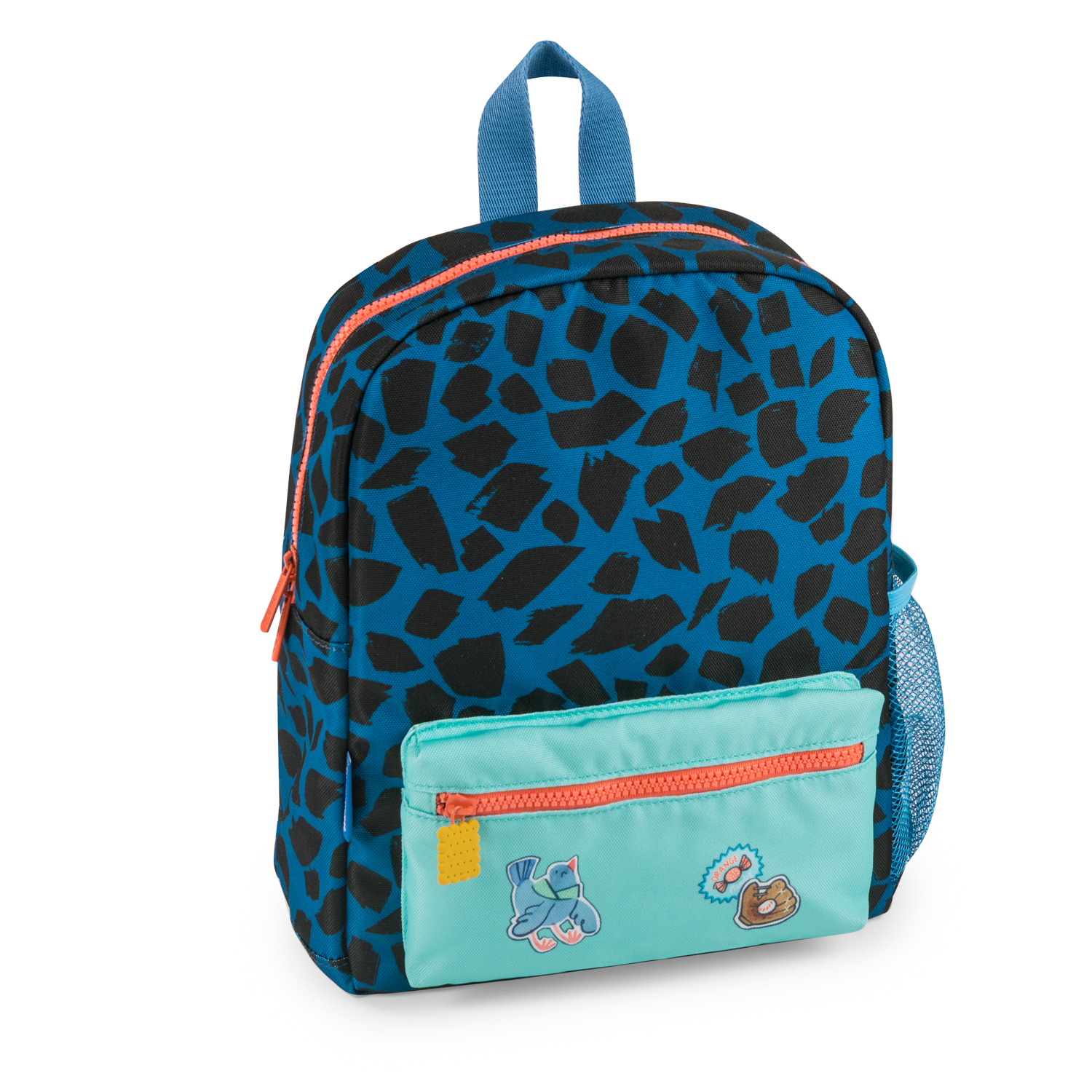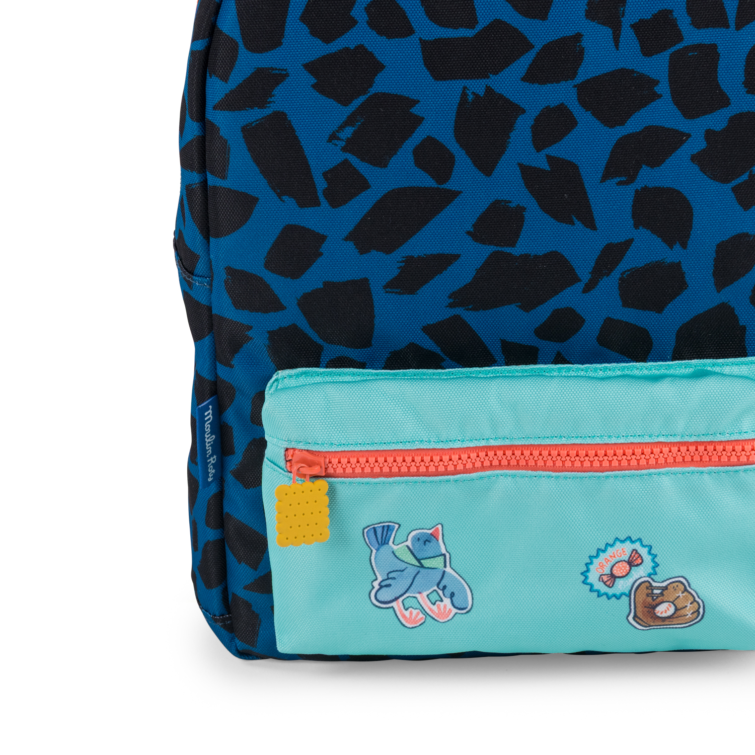 Szkolny plecak w kolorze granatowym w czarne wzorki pochodzące z kolekcji Puce&Pilou. Z przodu posiada kieszonkę w kontrastowym błękitnym kolorze zamykaną na zamek zwieńczony uroczą zawieszką w kształcie herbatnika. W środku znajduje się dodatkowa przegródka. Z boku znajduje się siateczkowa kieszeń np. na bidon. Komora główna pomieści format A4.