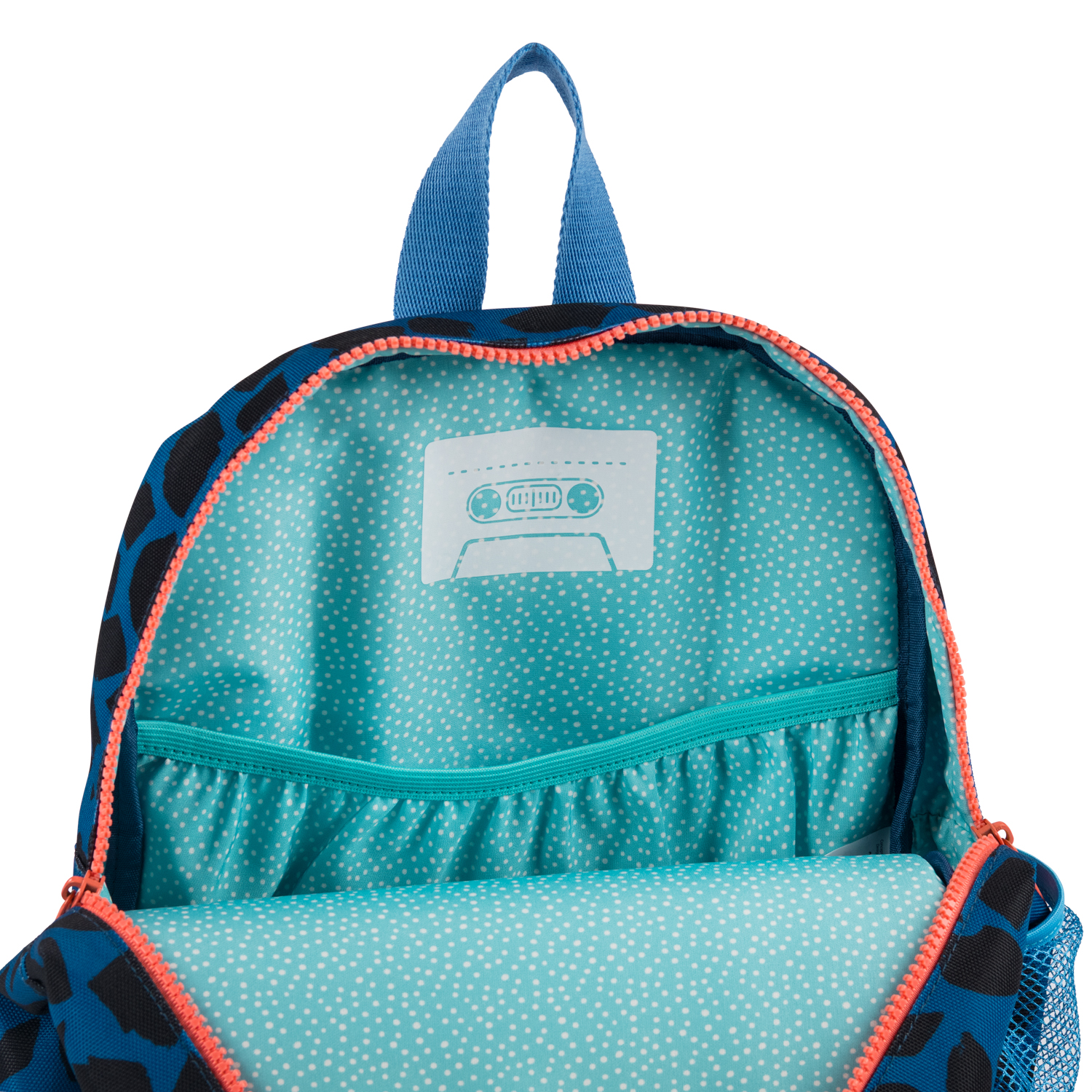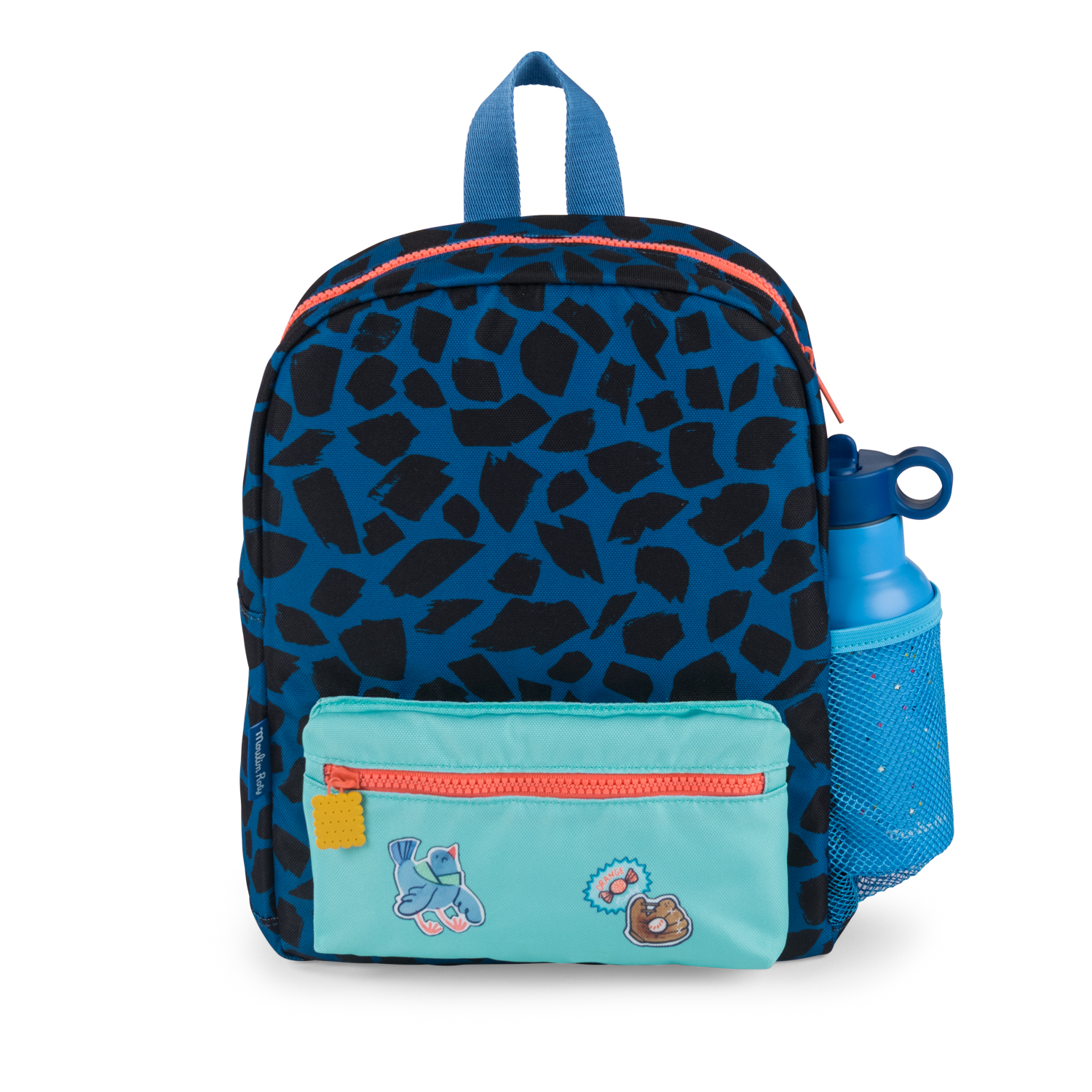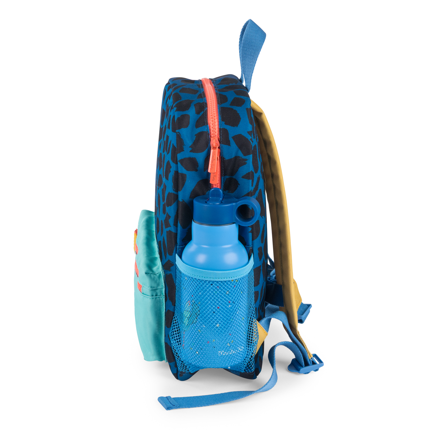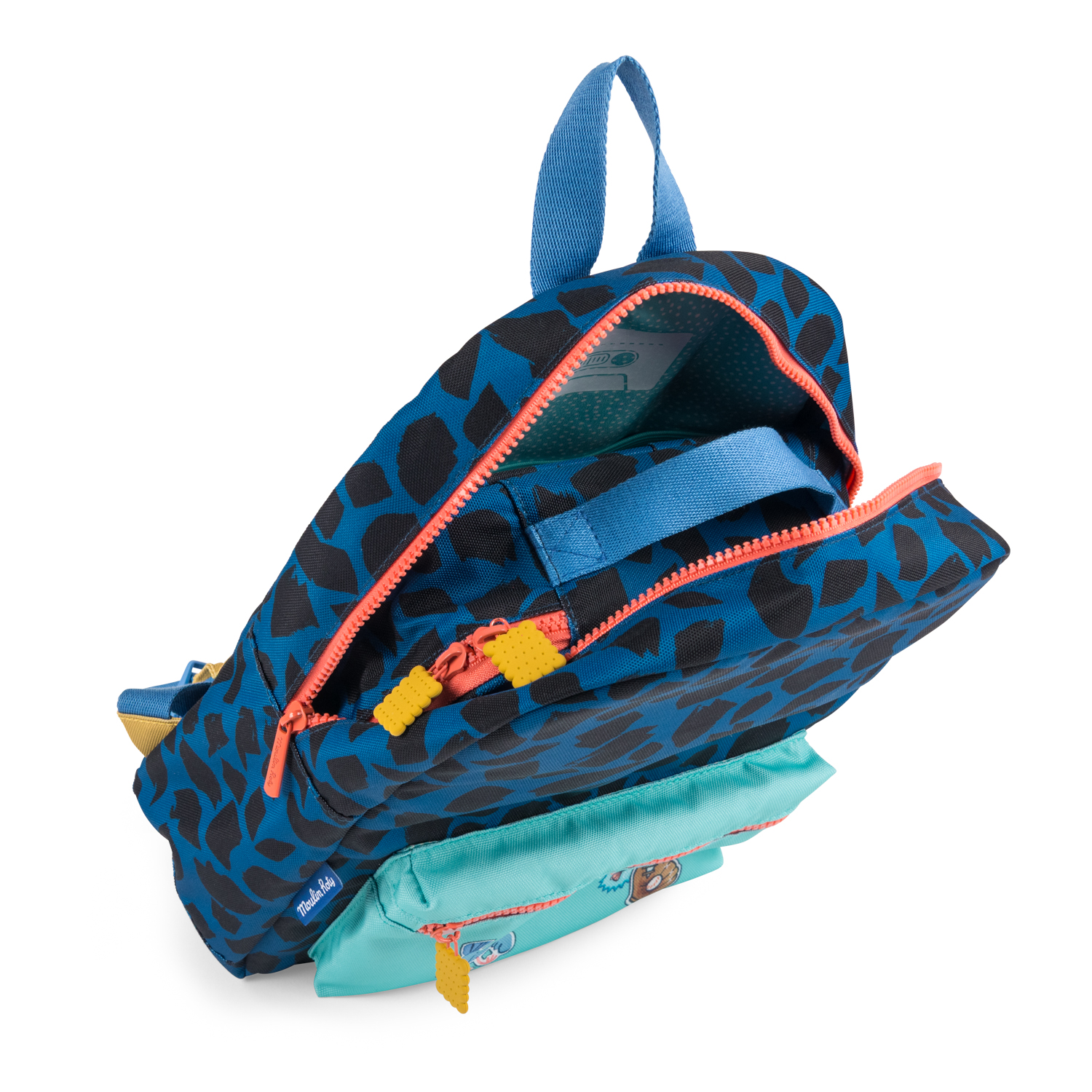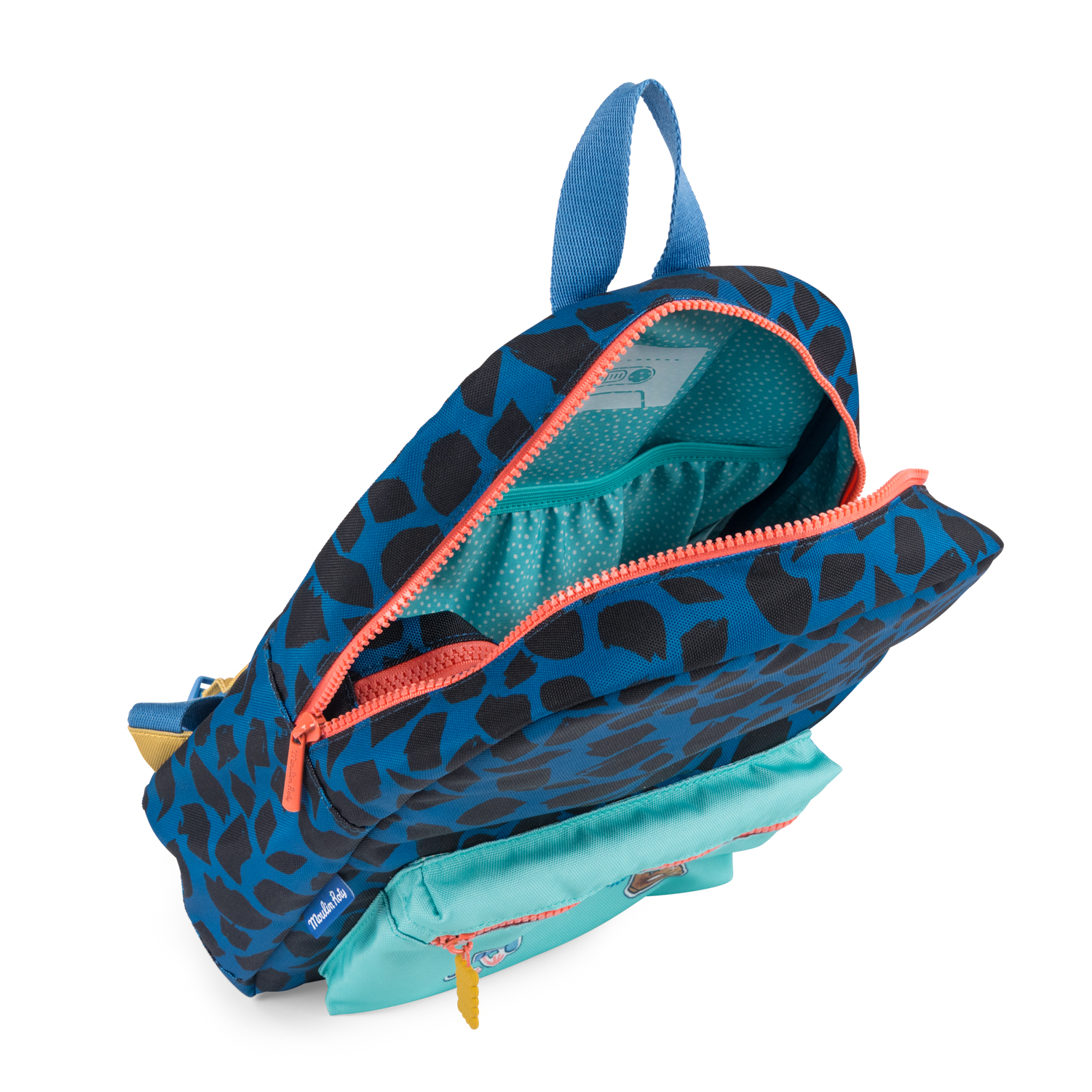 Szkolny plecak w kolorze granatowym w czarne wzorki pochodzące z kolekcji Puce&Pilou. Z przodu posiada kieszonkę w kontrastowym błękitnym kolorze zamykaną na zamek zwieńczony uroczą zawieszką w kształcie herbatnika. W środku znajduje się dodatkowa przegródka. Z boku znajduje się siateczkowa kieszeń np. na bidon. Komora główna pomieści format A4.