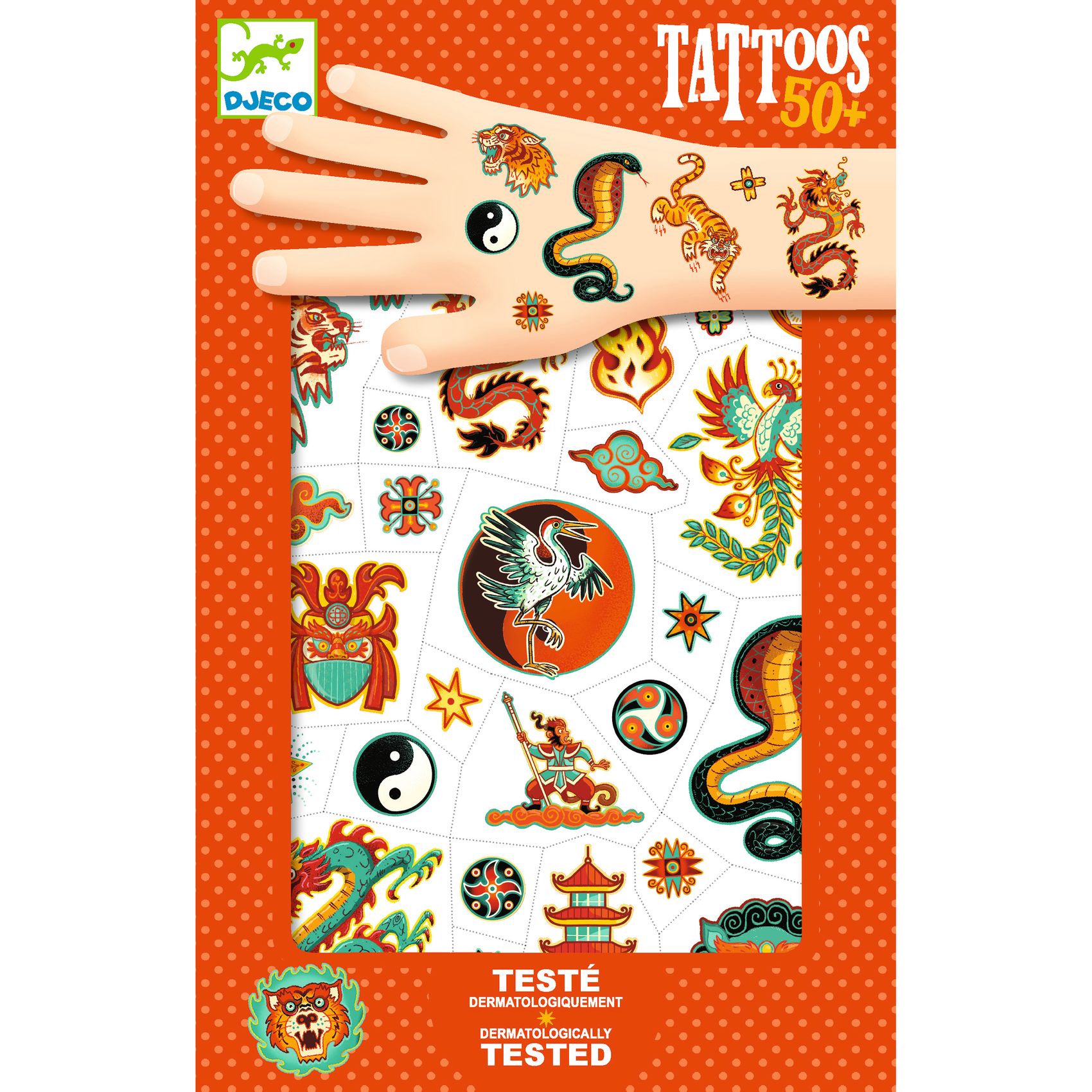Dwa arkusze pełne tatuaży inspirowanymi azjatyckimi sztukami walki. Oderwij wybrany tatuaż, delikatnie odklej ochronną folię, przyłóż tatuaż do skóry kolorową stroną i lekko zwilż papierek np. gąbką z wodą. Przyciśnij mocno papierek przez 30 sekund, potem delikatnie usuń, a tatuaż pozostanie na skórze. Testowane dermatologiczne.