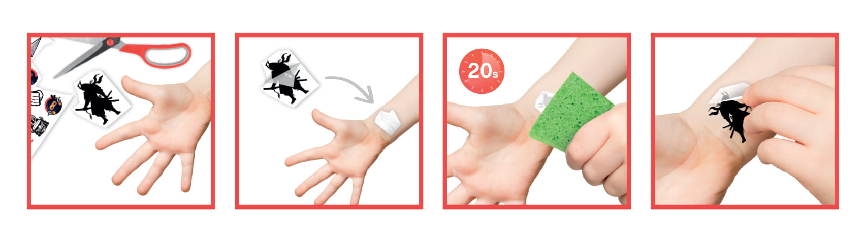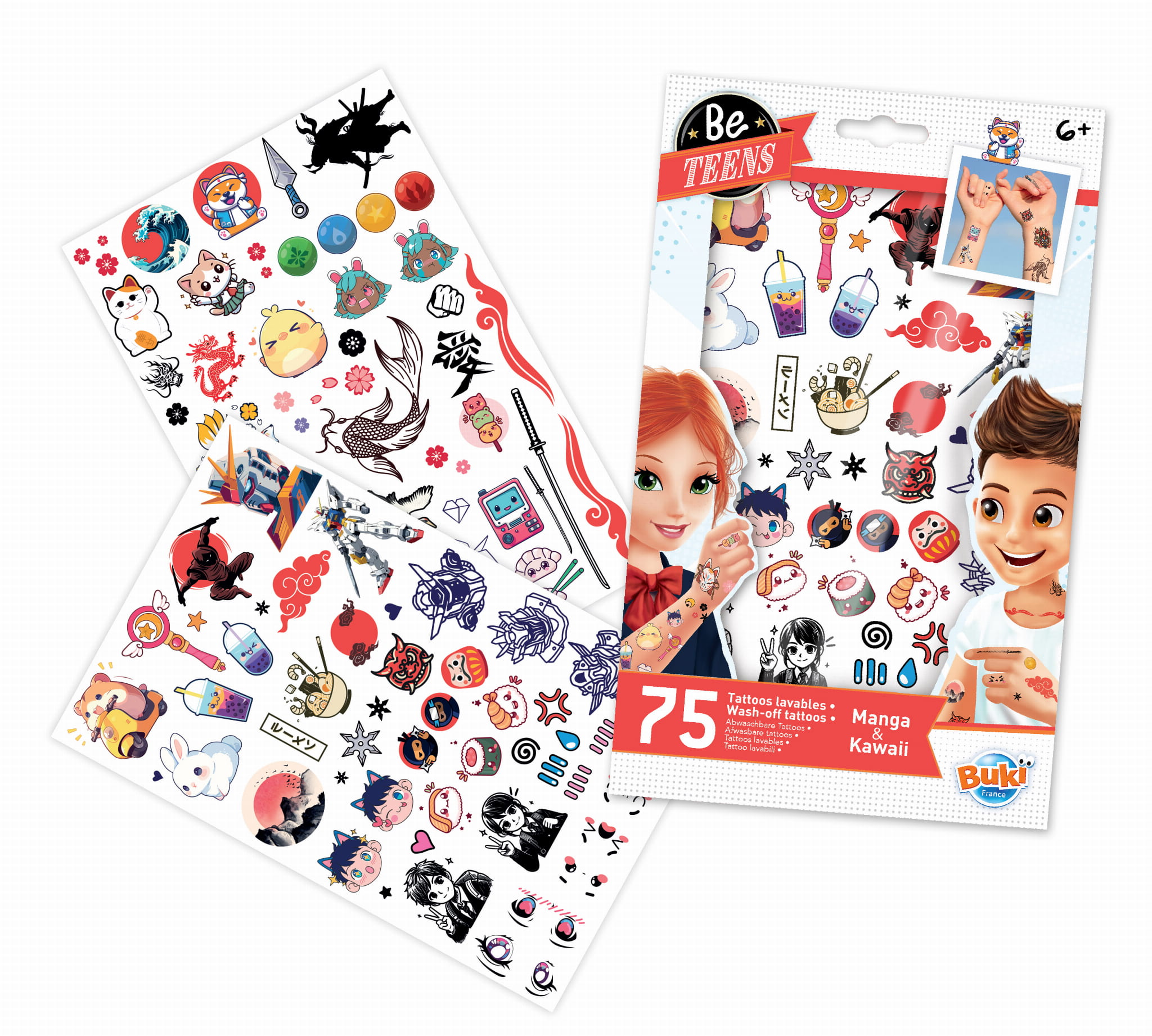 Zestaw 75 tatuaży z motywami prosto z japońskiego komiksu typu manga. Aplikacja wzorów na skórze jest banalnie prosta - wystarczy wyciąć wybrany wzór, zdjąć folię ochronną, przyłożyć tatuaż kolorową stroną do skóry i przykładać wilgotną gąbeczkę lub chusteczkę przez około 20 sekund.