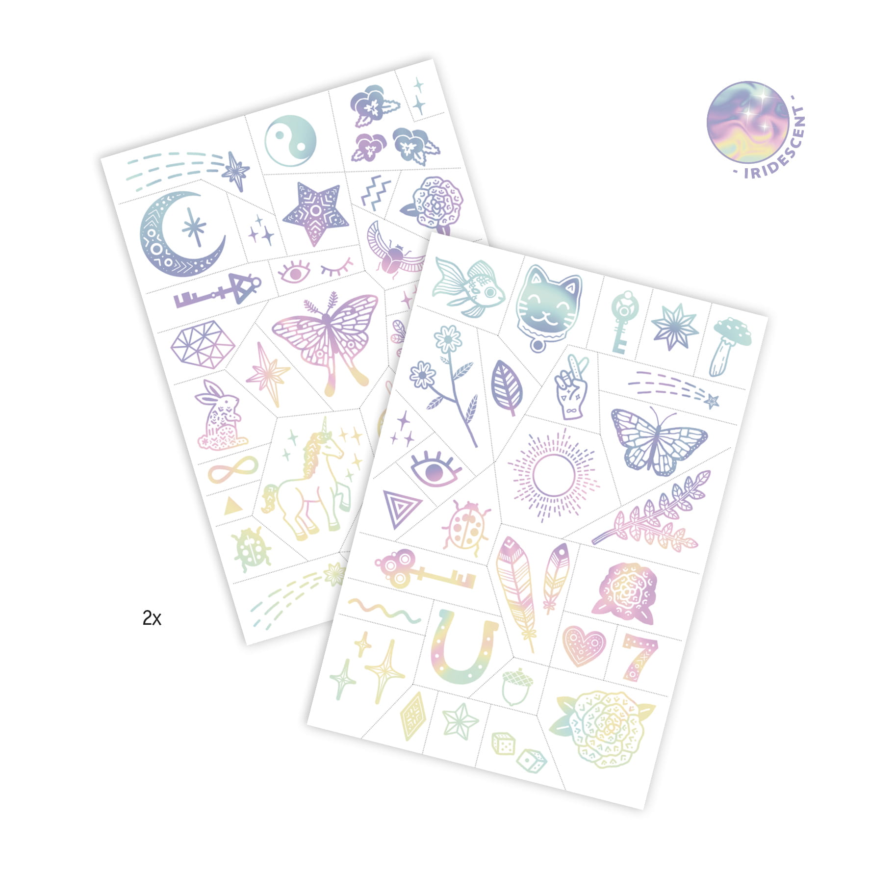 Dwa arkusze pełne kolorowych tatuaży. Wytnij wybrany tatuaż, delikatnie odklej ochronną folię, przyłóż tatuaż do skóry i lekko zwilż papierek. Przyciśnij mocno papierek przez 30 sekund, potem delikatnie usuń, a tatuaż pozostanie na skórze.