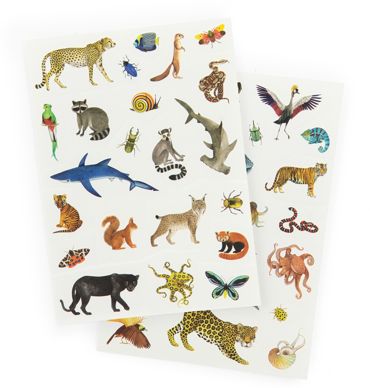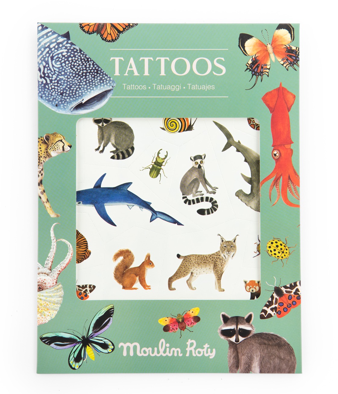 Bajeczny świat kolekcji Dookoła Świata teraz dostępny w formie zmywalnych tatuaży! Ilustracje Cécile Blindermann znajdują się na 2 arkuszach, które są wstępnie wycięte, aby ułatwić wybieranie odpowiednich wzorów.