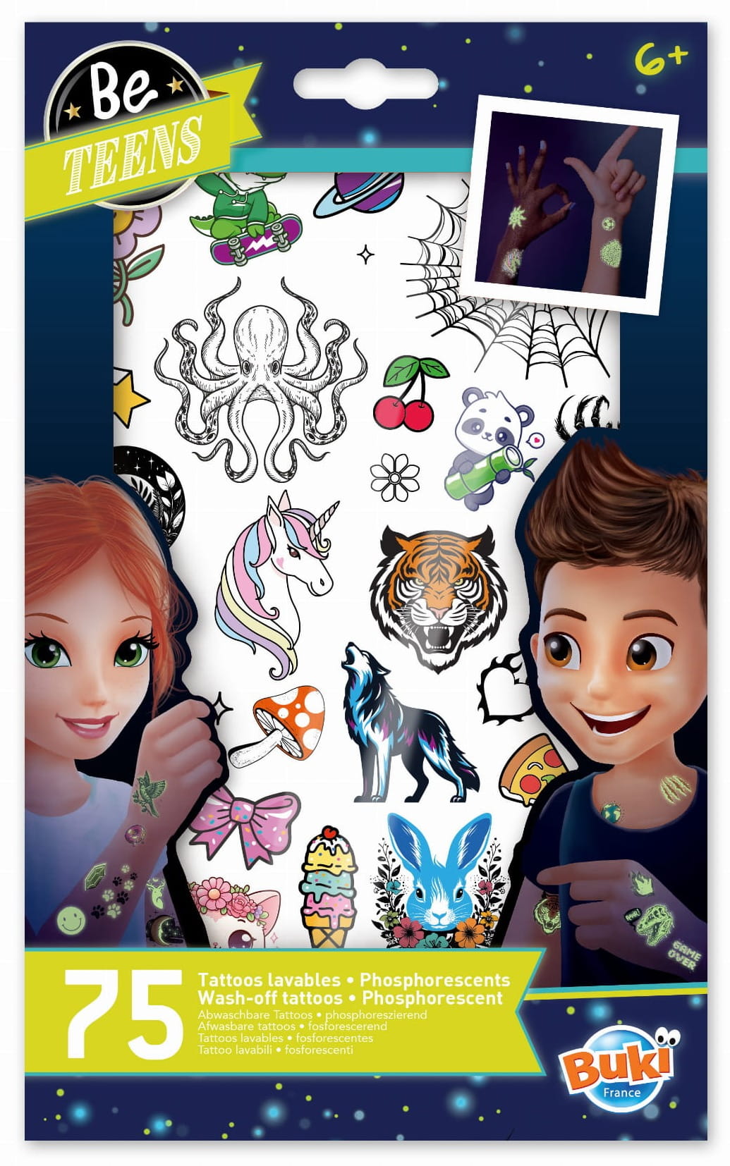 Zestaw 75 tatuaży świecących w ciemności. Aplikacja wzorów na skórze jest