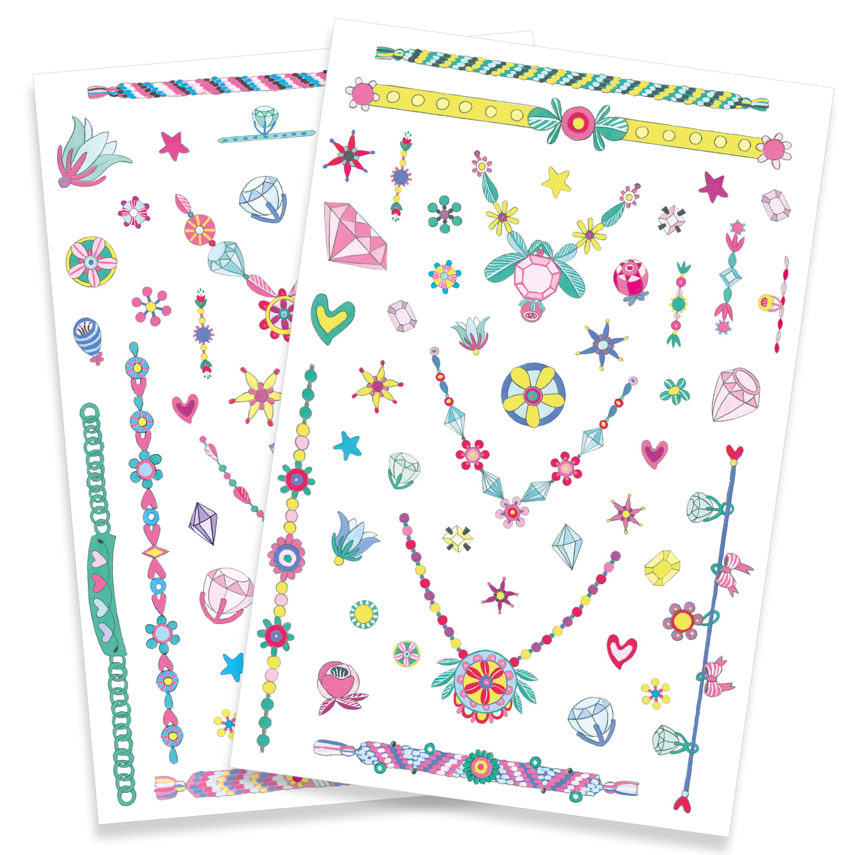 Dwa arkusze pełne kolorowych tatuaży. Wytnij wybrany tatuaż, delikatnie odklej ochronną folię, przyłóż tatuaż do skóry i lekko zwilż papierek. Przyciśnij mocno papierek przez 30 sekund, potem delikatnie usuń, a tatuaż pozostanie na skórze.
