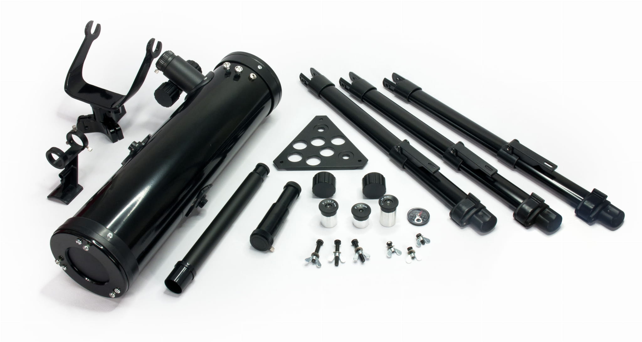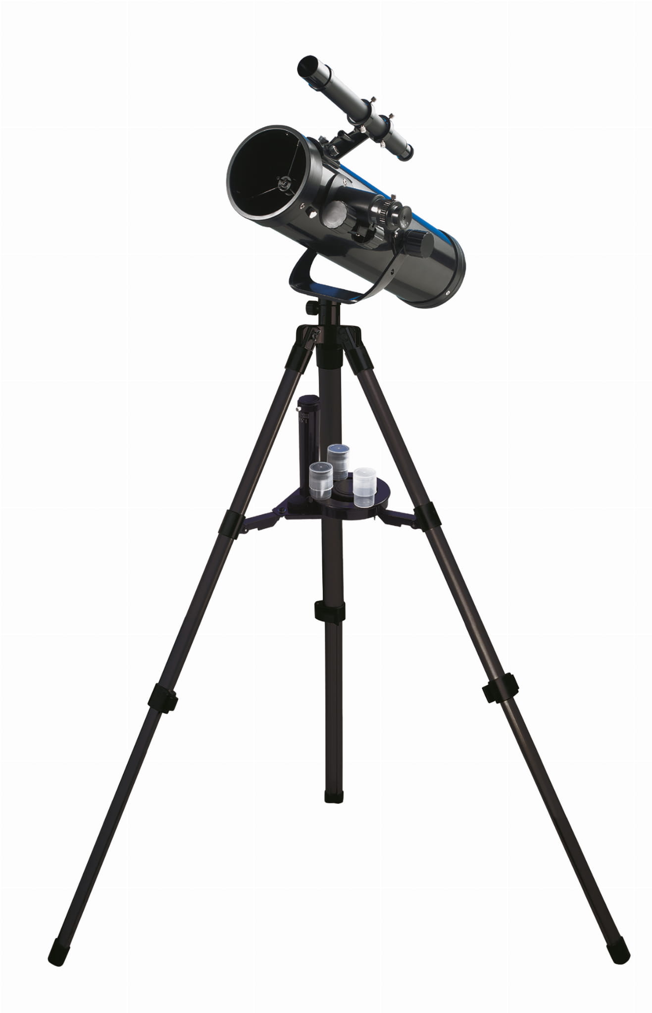 Lustro o średnicy 76 mm oraz 3 wymienne okulary (20, 15,5 i 4 mm). Statywpodłogowy o wysokości 76 cm. Tubus oraz statyw są metalowe.
