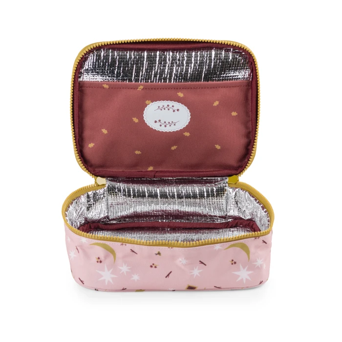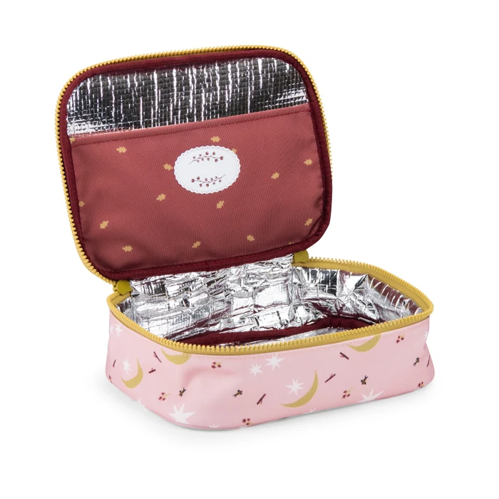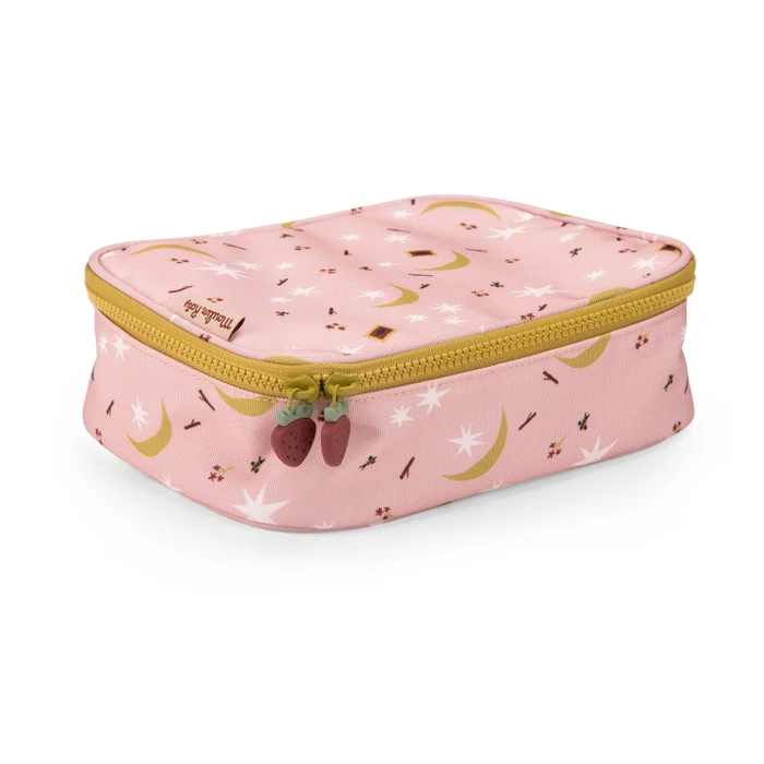 Torba termiczna w kolorze bladego różu w drobny wzór pochodzący z kolekcji Apres La Pluie. W środku posiada bordową kieszonkę w złote listki, do której można włożyć np. sztućce. Torba jest zamykana na zamek w kontrastowym żółtym kolorze, który jest zwieńczony uroczymi przywieszkami w kształcie truskawek.