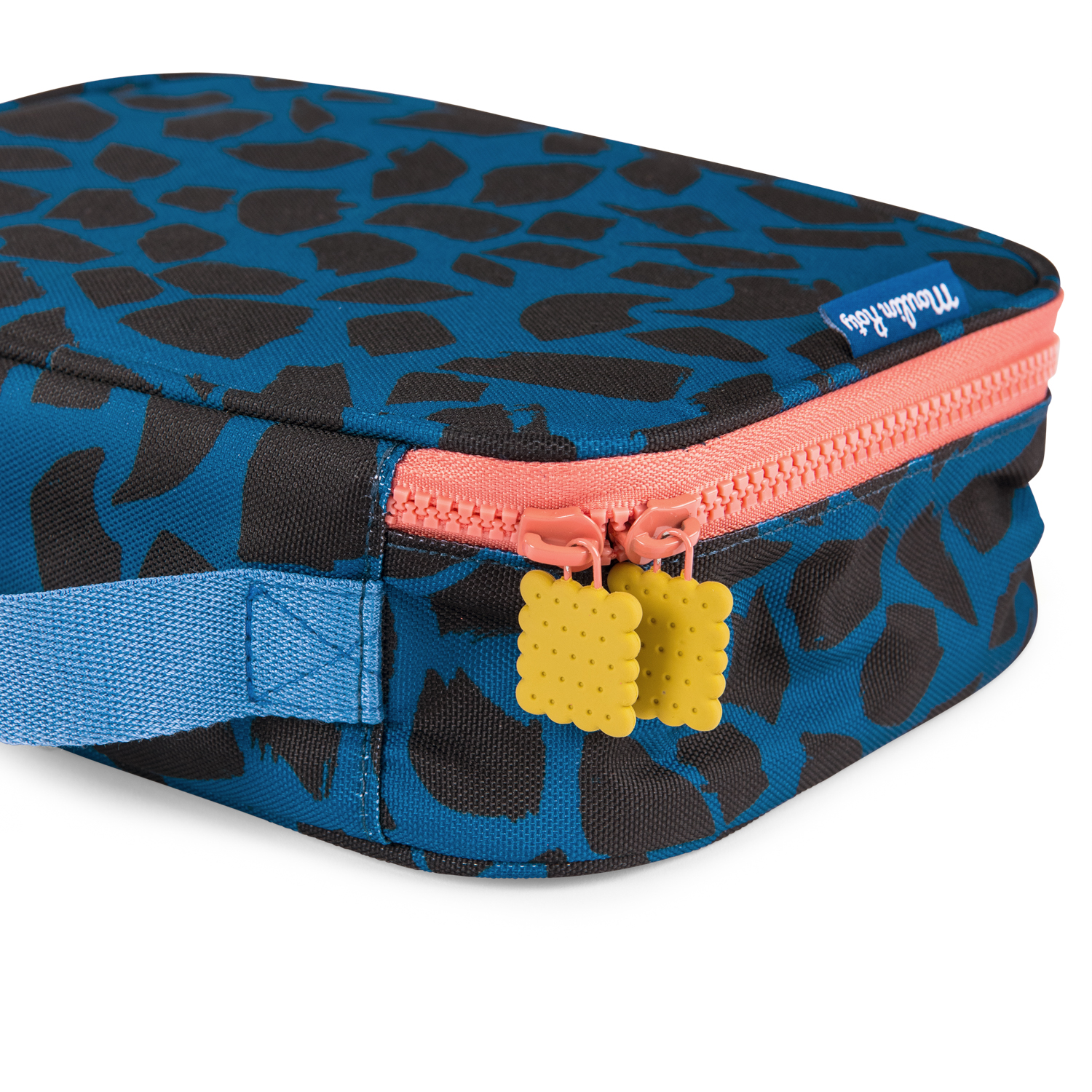 Torba termiczna w kolorze granatowym w czarne wzorki pochodzące z kolekcji Puce & Pilou. W środku posiada kieszonkę ilustrowaną kasetą magnetofonową, do której można włożyć np. sztućce. Torba jest zamykana na zamek w kontrastowym łososiowym kolorze, który jest zwieńczony uroczymi przywieszkami w kształcie herbatników.