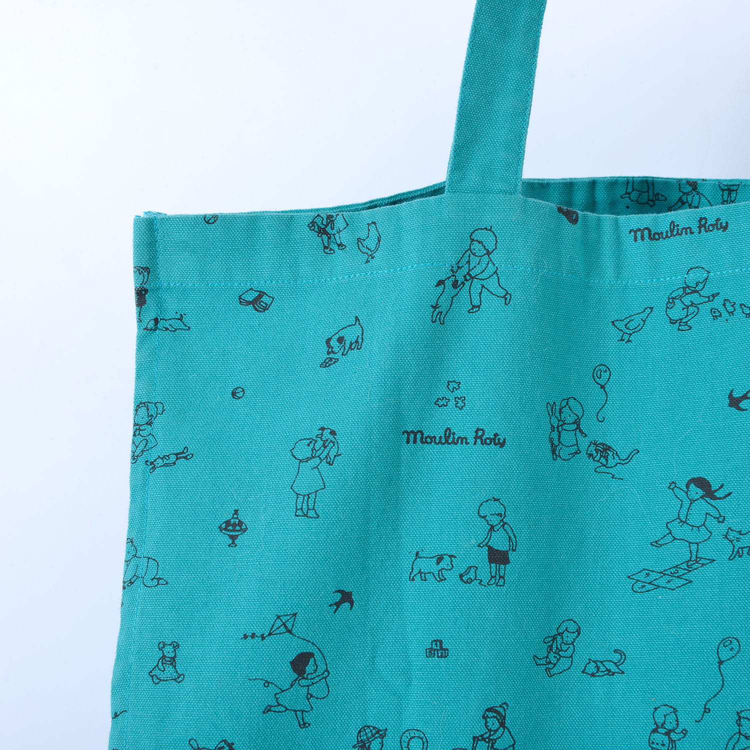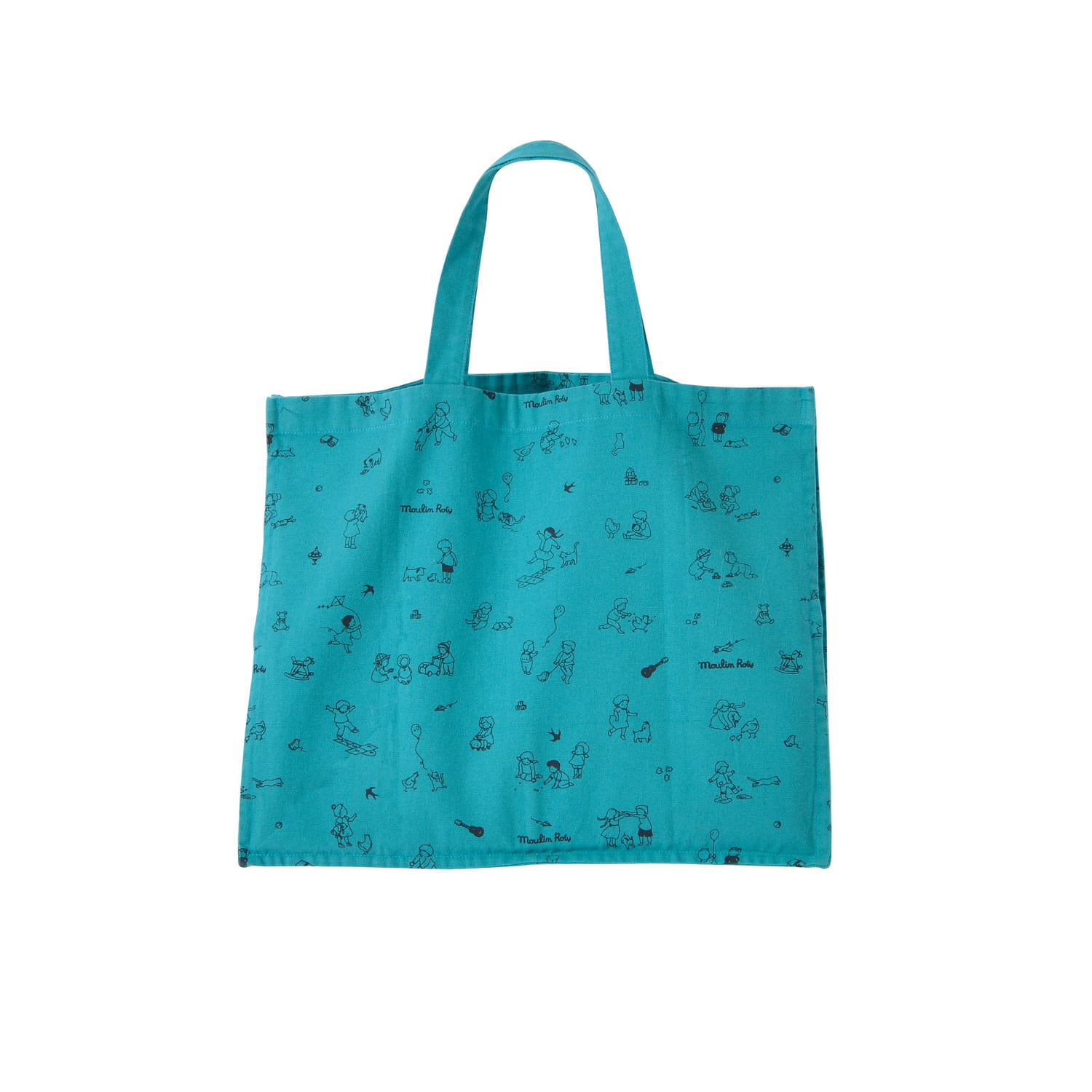 turkusowa torba z materiału ilustrowana unikalnym wzorem od Moulin Roty.