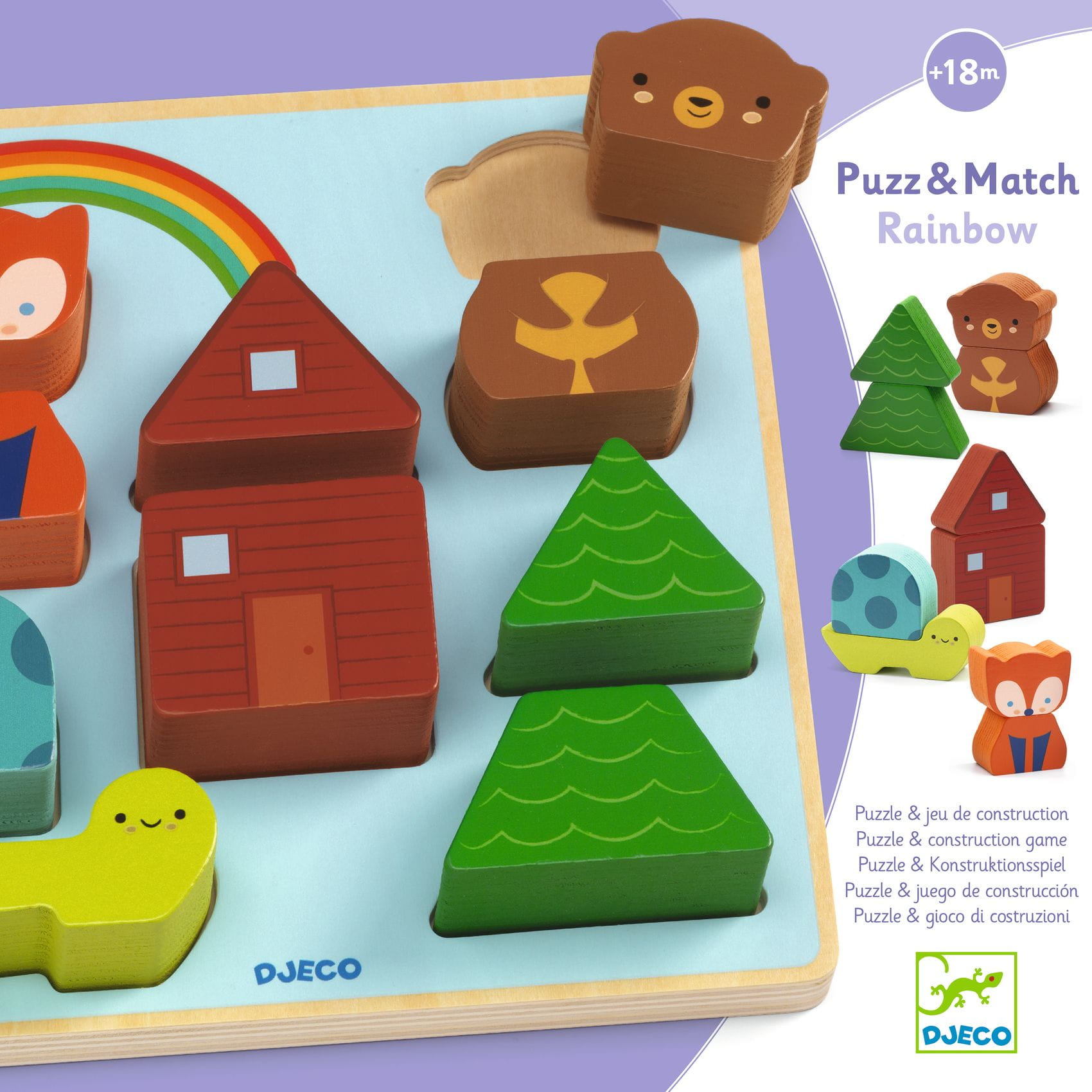Puzz & Match to drewniana układanka polegająca na układaniu 2-częściowych elementów w odpowiednich otworach pasujących kształtem na drewnianej planszy. Dzieci mogą też bawić się, wymieniając elementy i tworząc zwierzątka według swojej wyobraźni. Duże elementy są łatwe do chwycenia przez małe rączki dziecka. Drewniane elementy można też postawić pionowo i bawić się nimi jak figurkami. Walory edukacyjne: ćwiczenie małej motoryki dłoni, koncentracji, uwagi, koordynacji oko-ręka. Zabawka zapakowana w kolorowe pudełko, łatwe do przechowywania. Wykonana z drewna posiadającego certyfikat FSC®.