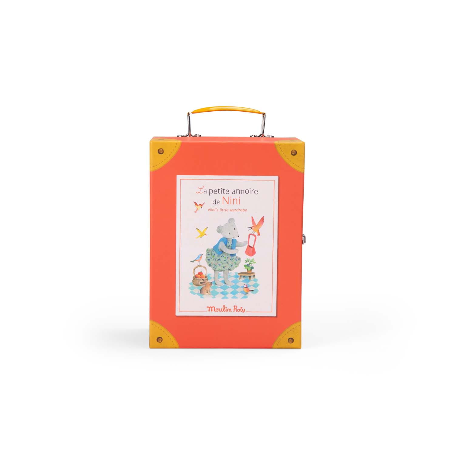 Myszka NINI wybiera się na długi spacer po malowniczej łące. Potrzebuje pomocy przy wyborze odpowiedniego ubrania. Walizka z garderobą i lustrem jest wyposażona na każdą pogodę. Na uroczych wieszaczkach znajduje się 6 ubrań do wyboru: żółty płaszcz przeciwdeszczowy w urocze groszki, spodnie w kratę, kwiecista sukienka, bluzeczka, spodenki i kamizelka. Wszystko co niezbędne, aby ubrać się na "cebulkę".