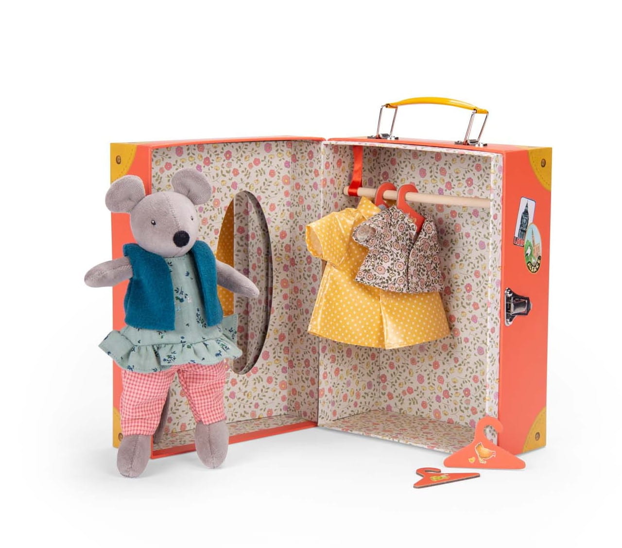 Ilustrowana walizka jest zamykana na wygodny zatrzask. W środku znajduje się kwiatowy print, lustro oraz drewniany drążek na dołączone do zestawu wieszaczki.