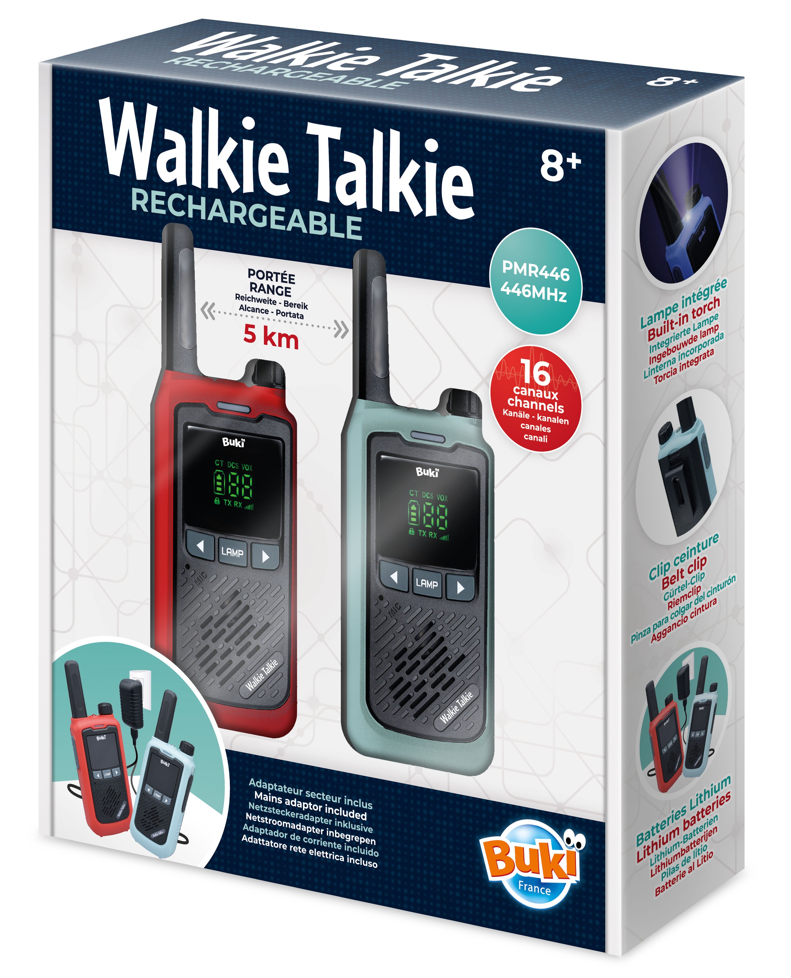 Zestaw 2 walkie-talkie z 5-cio km zasięgiem. Te krótkofalówki o dużym zasięgu są wyposażone w dwa akumulatory litowe i podwójną ładowarkę sieciową. Ulepszone mikrofony i głośniki zapewniają wyraźniejsze rozmowy.