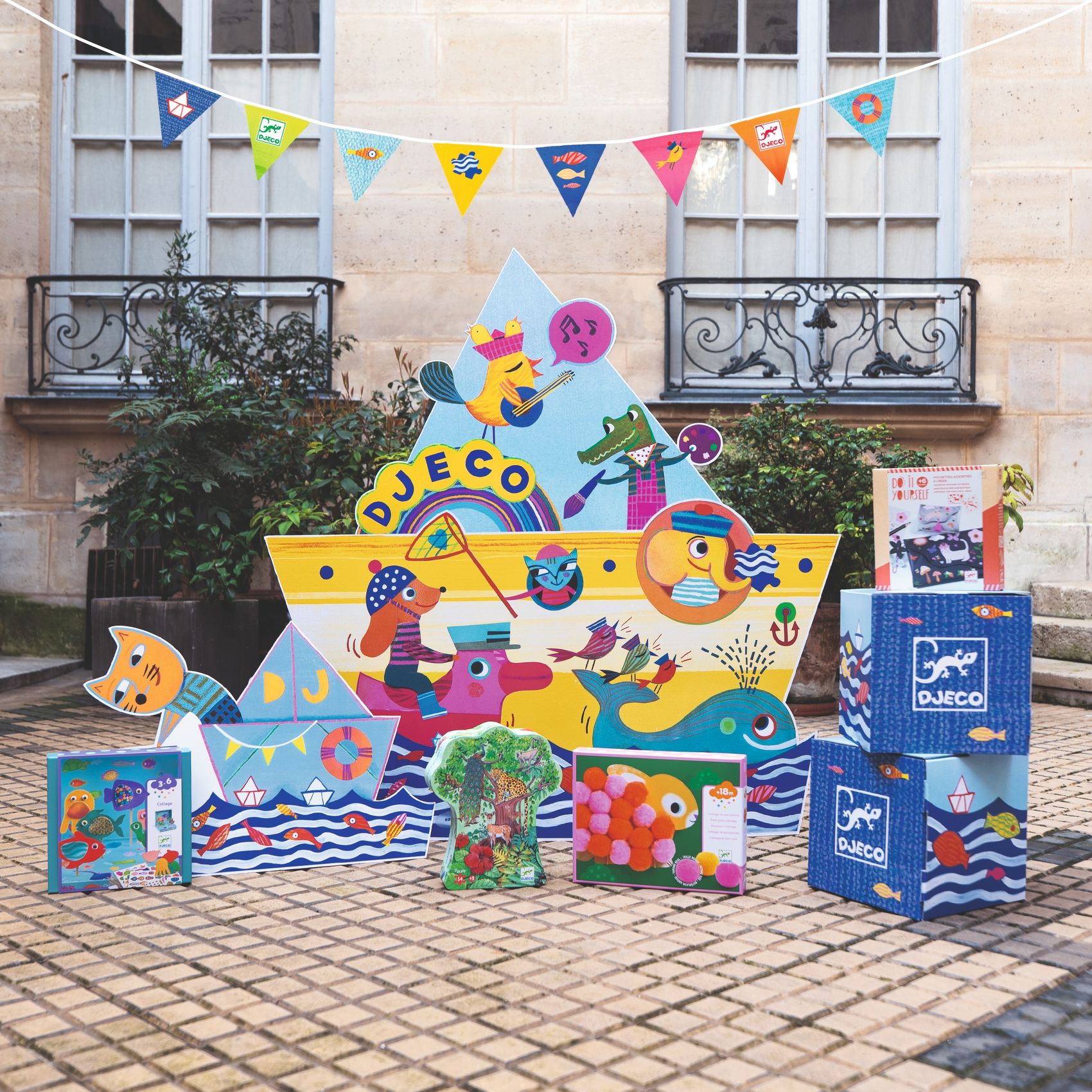 Wiosenny window kit od Djeco do ozdobienia witryny sklepowej lub ekspozycji wewnątrz sklepu.