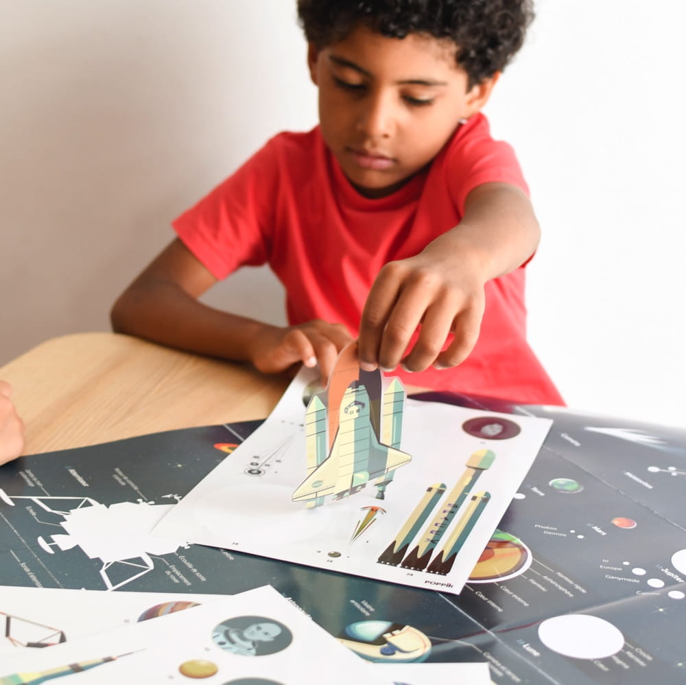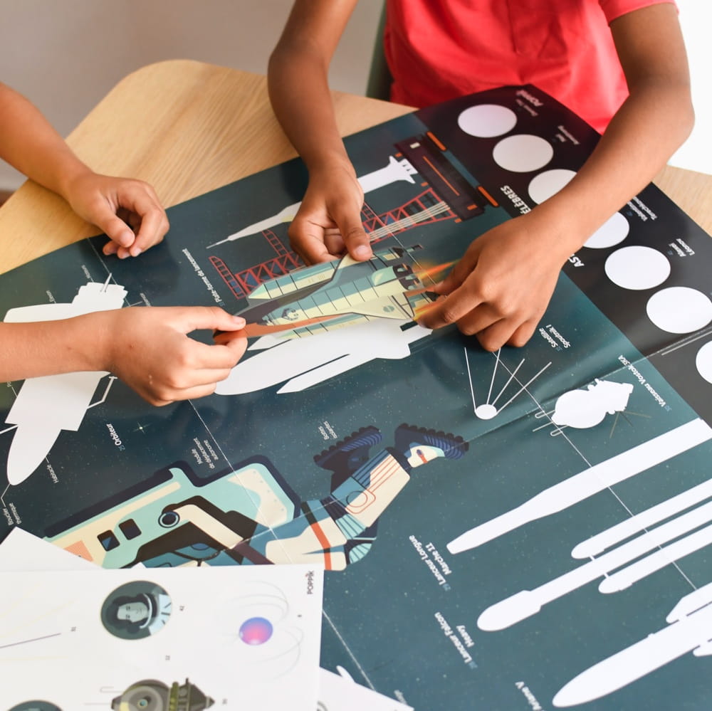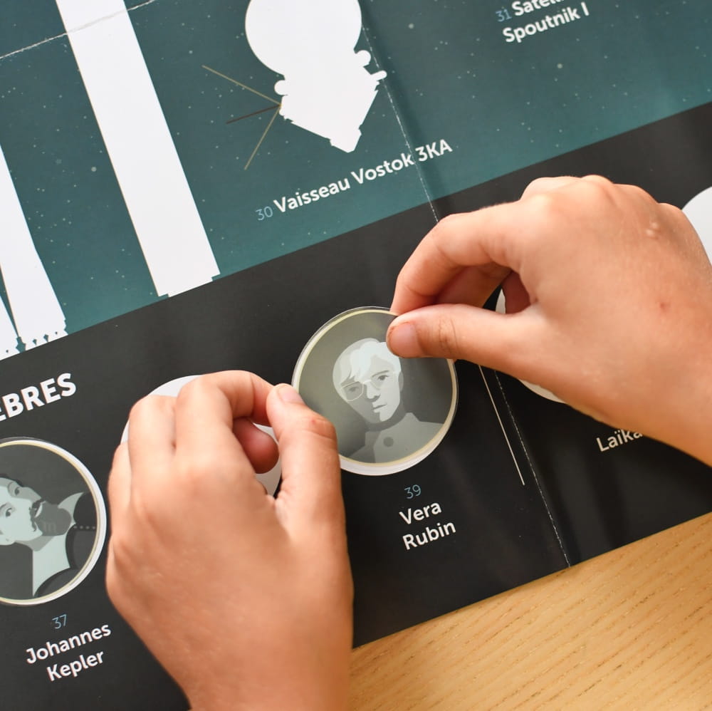 Plakat idealny dla pasjonatów kosmosu. Dziecko nakleja na plakacie 40 dużych