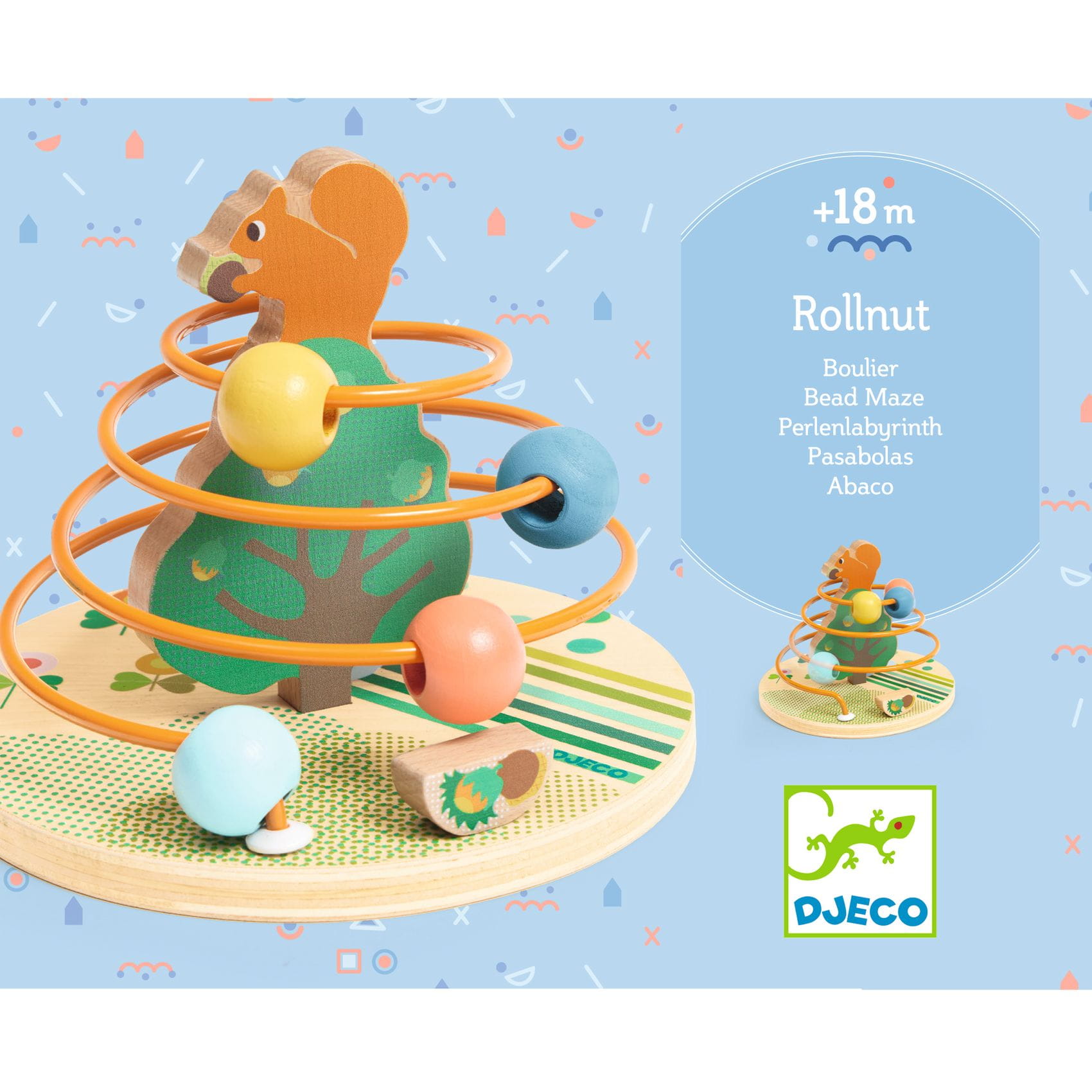Zabawka wczesnorozwojowa RollNut to idealna propozycja dla maluszków od 18. miesiąca życia. Na drewnianej podstawce znajduje się drzewko z wiewiórką otoczone metalowym prętem, który układa się w kształt stożka i po którym przesuwają się 4 kolorowe koraliki. Zabawa polega na zsuwaniu i przesuwaniu koralików od góry do dołu po okręgach. Elementy zestawu wykonane są z drewna posiadającego certyfikat FSC®.