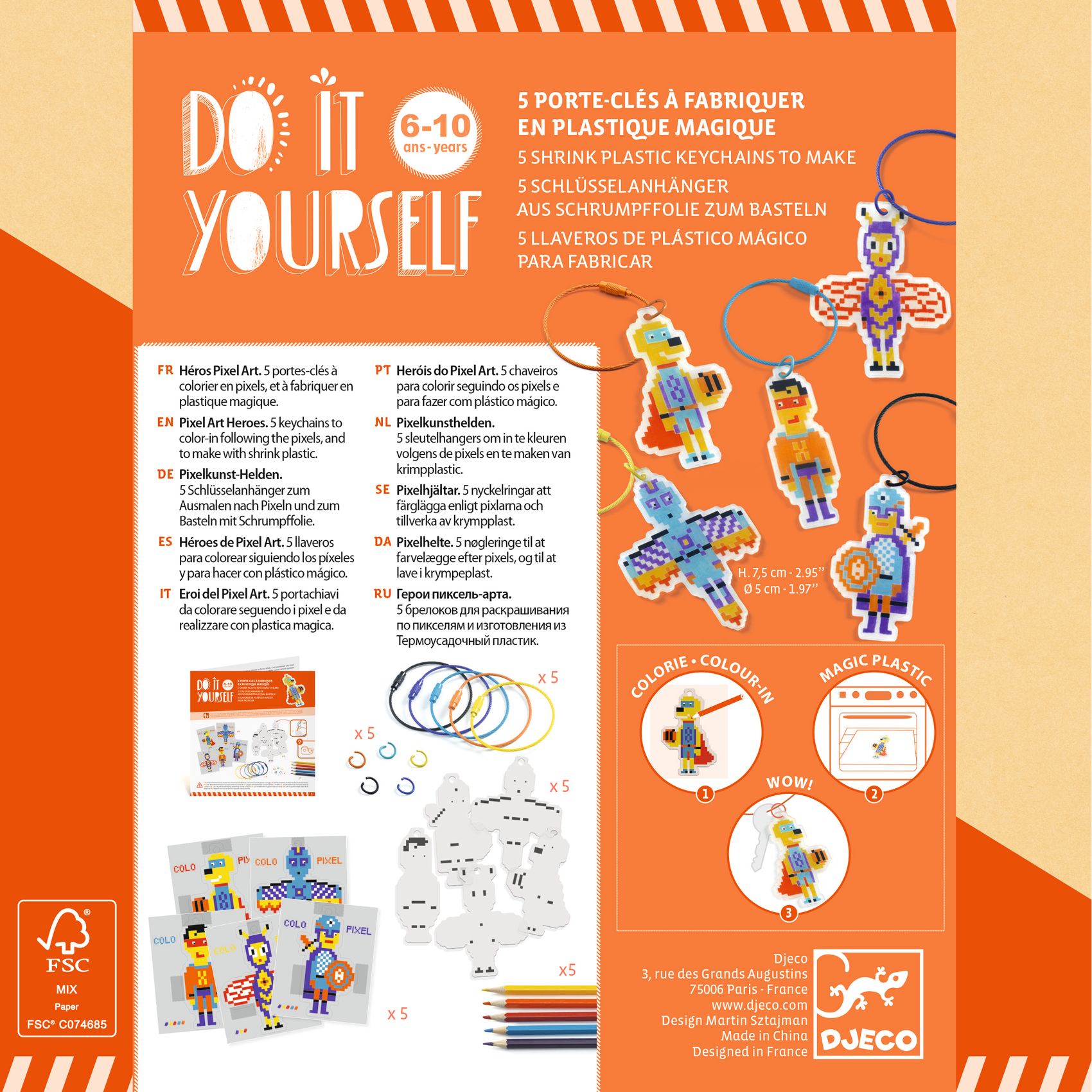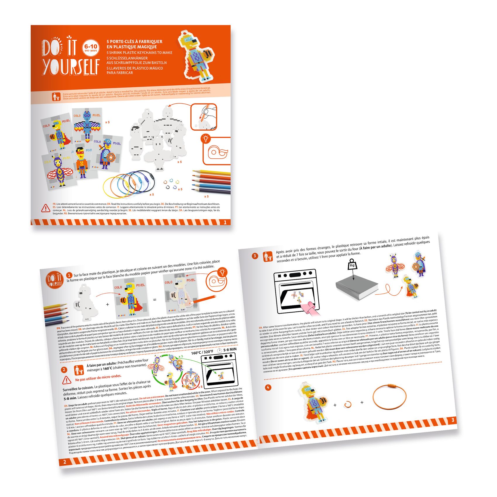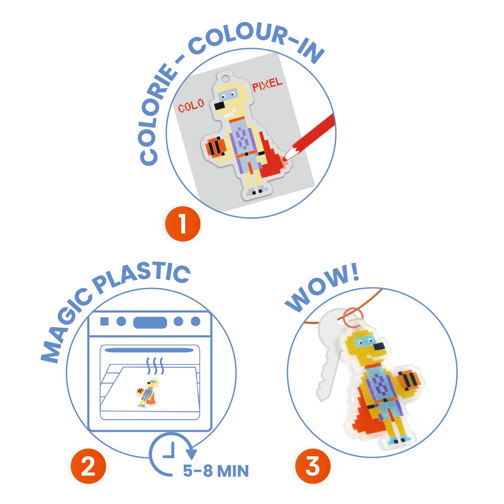 Zestaw artystyczny polegający na utworzeniu pięciu breloczków z magicznego plastiku. Wzory przedstawiają superbohaterów w wersji pikselowej.