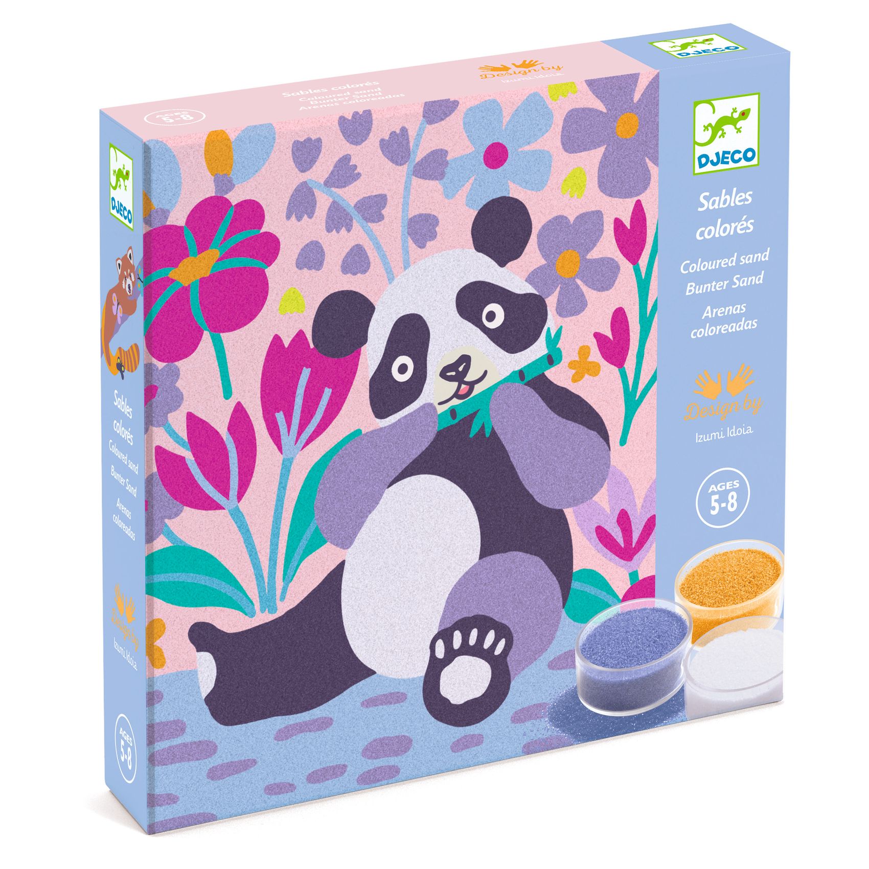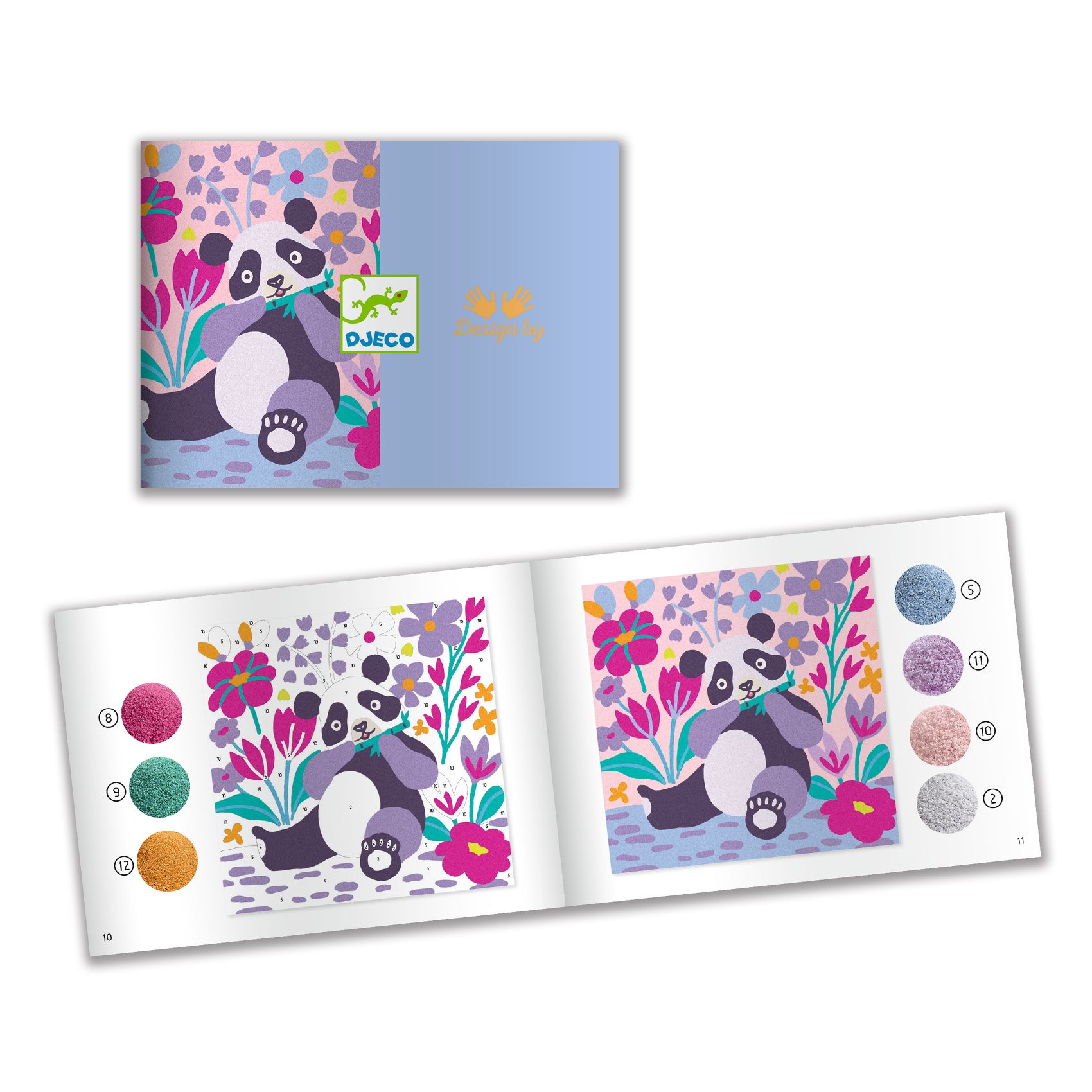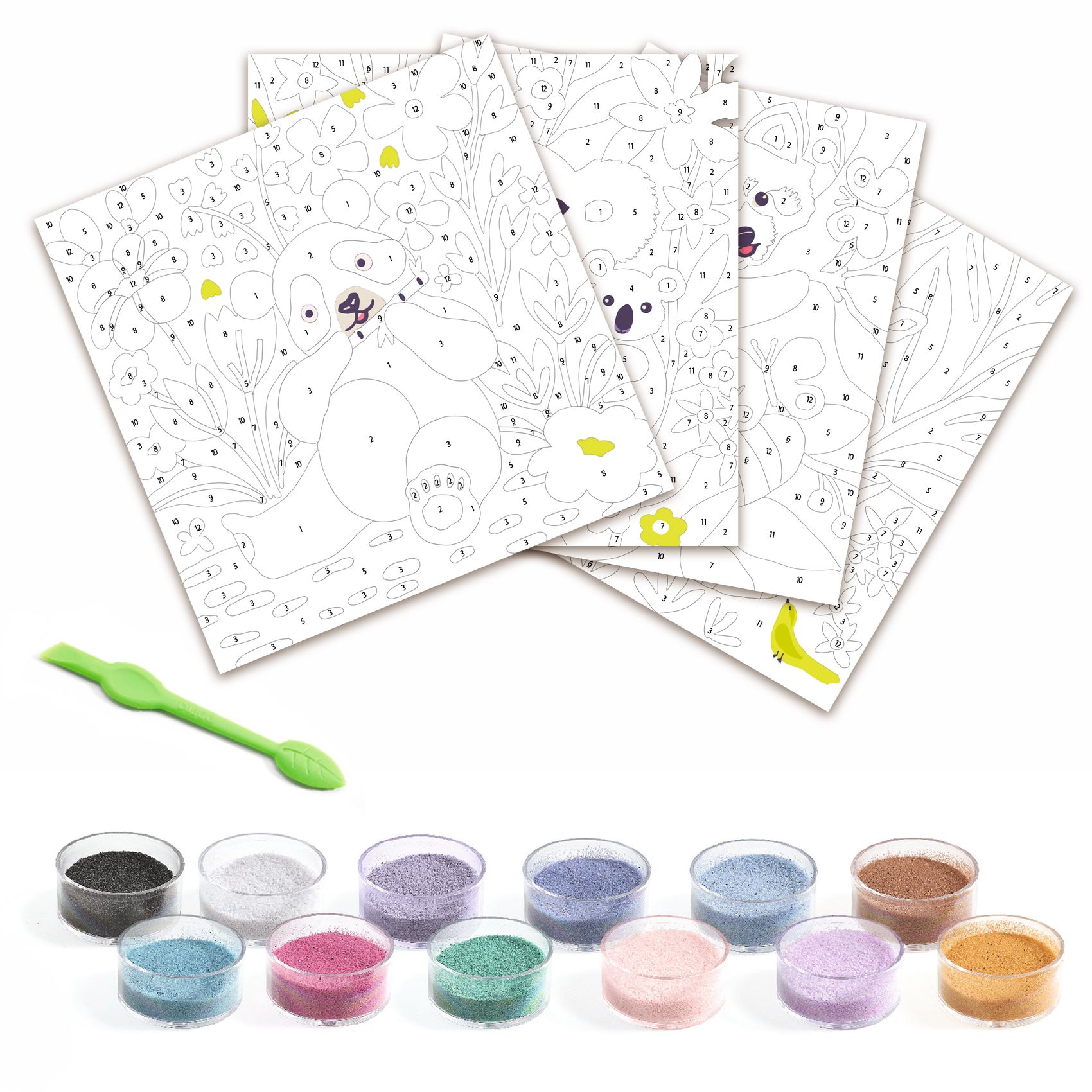 Zestaw artystyczny, w którym dziecko dekoruje obrazki za pomocą wielobarwnych piasków w pastelowych odcieniach. Kartka jest pokryta klejem, który przykryty jest ochronnym papierem. Za pomocą plastikowego rylca dziecko odkleja poszczególne kawałki papieru, odkrywając samoprzylepne pola i posypując je odpowiednim kolorem piasku. Dziecko ozdabia obrazek w pudełku, aby nie rozsypywać piasku, a nadmiar zsypuje się do pojemniczków przez specjalny otwór w rogu.