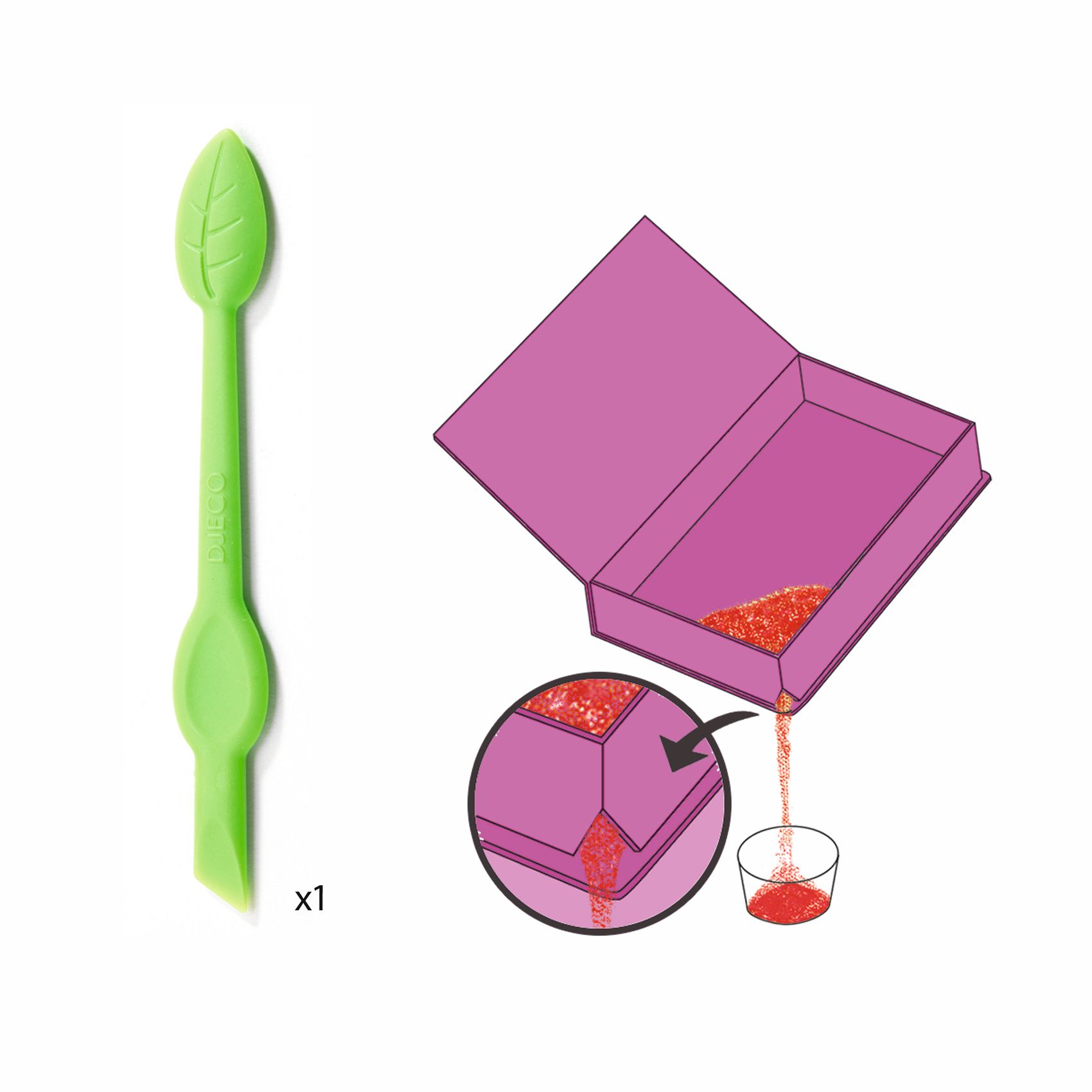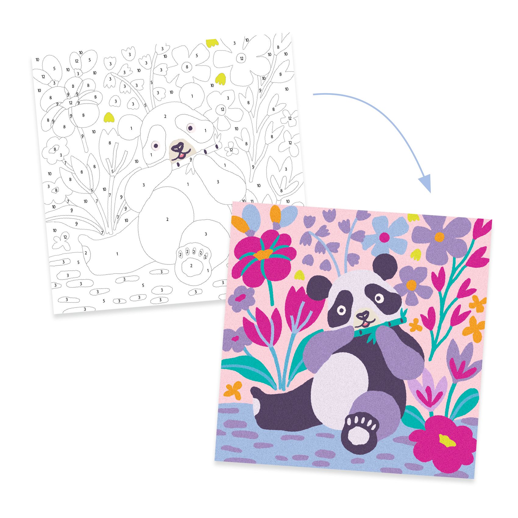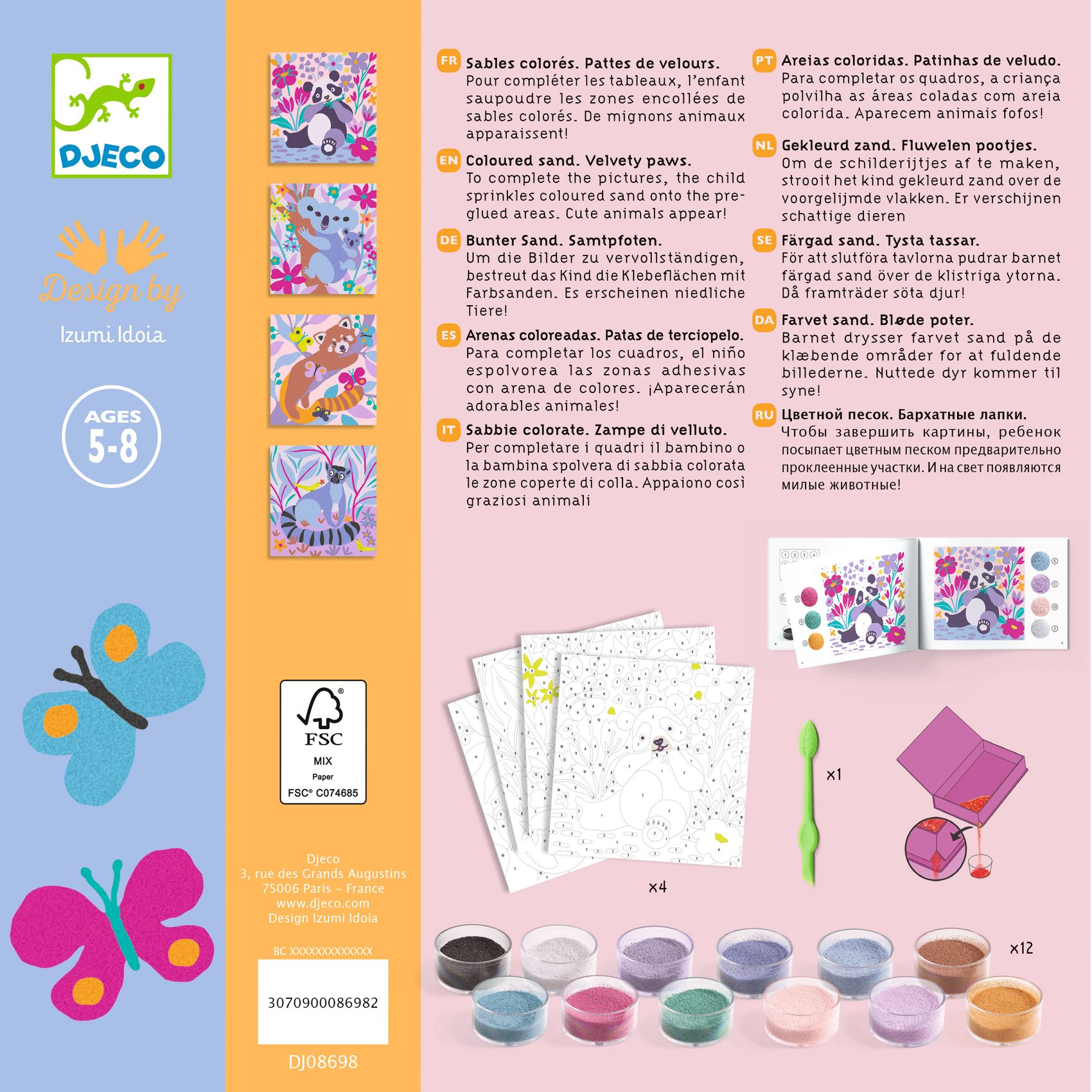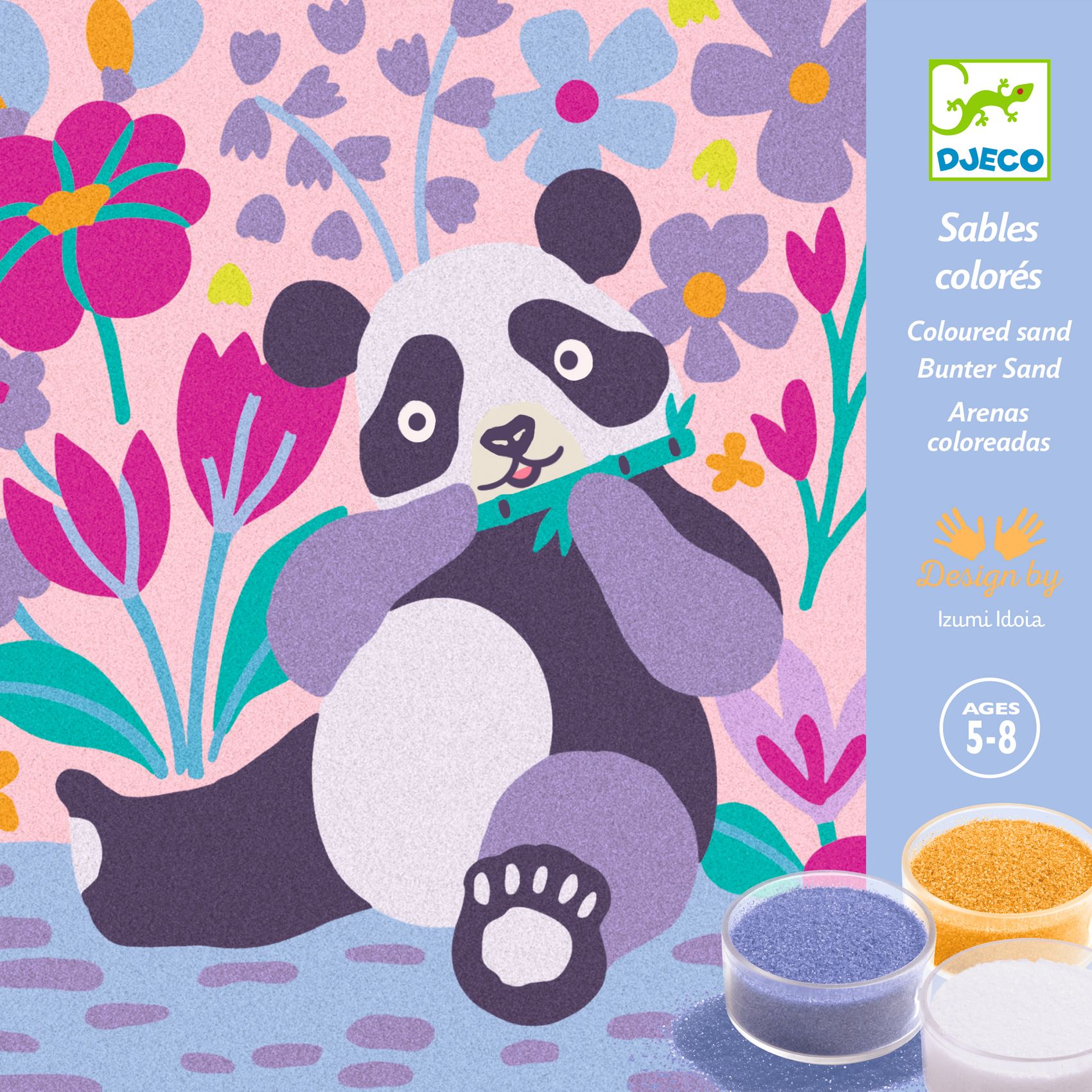 Zestaw artystyczny, w którym dziecko dekoruje obrazki za pomocą wielobarwnych piasków w pastelowych odcieniach. Kartka jest pokryta klejem, który przykryty jest ochronnym papierem. Za pomocą plastikowego rylca dziecko odkleja poszczególne kawałki papieru, odkrywając samoprzylepne pola i posypując je odpowiednim kolorem piasku. Dziecko ozdabia obrazek w pudełku, aby nie rozsypywać piasku, a nadmiar zsypuje się do pojemniczków przez specjalny otwór w rogu.
