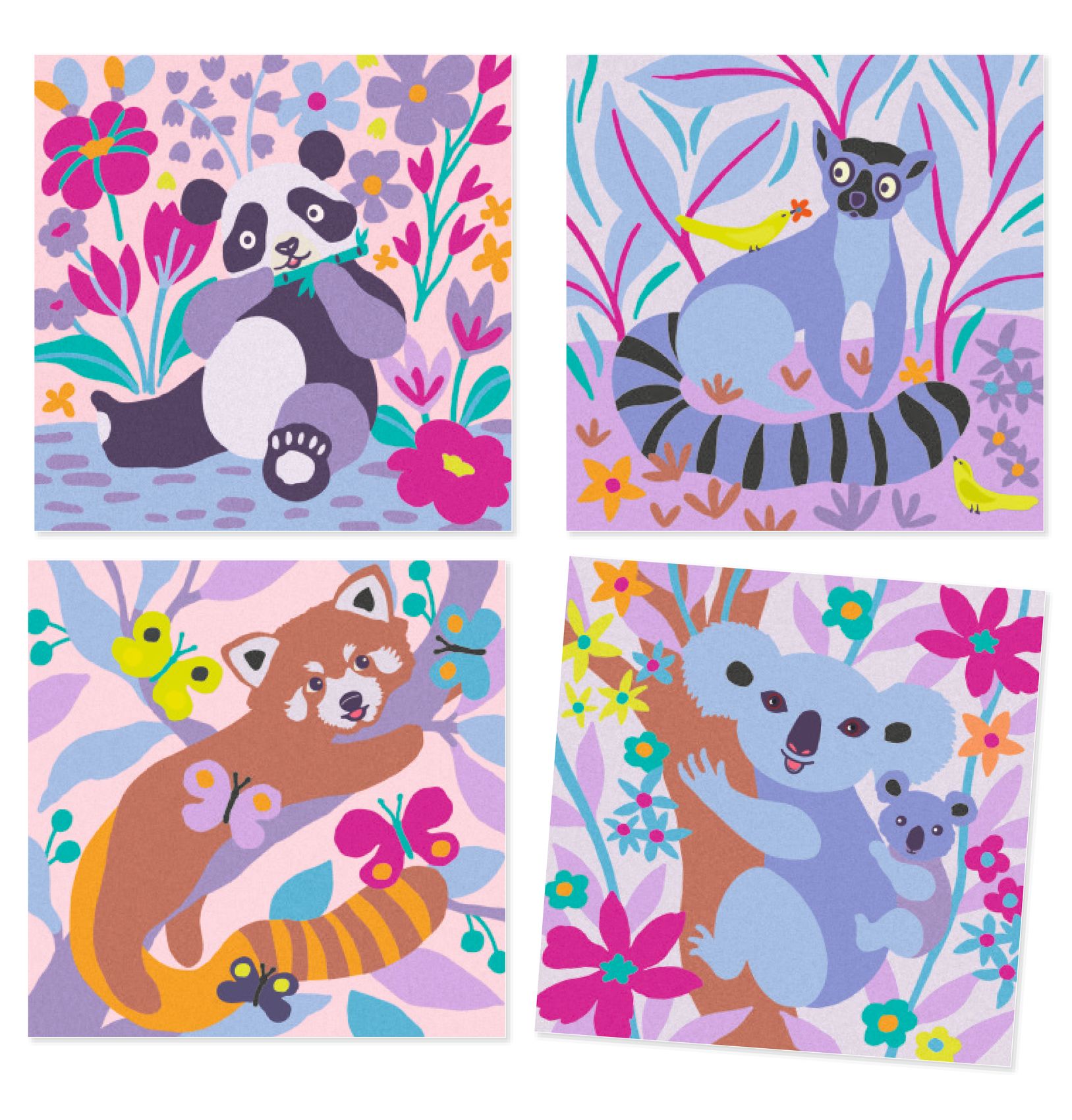 Zestaw zawiera 4 ilustracje przedstawiające różne zwierzątka np. pandę lub lemura w otoczeniu bujnej roślinności. Instrukcja krok po kroku pozwala po kolei ozdabiać rysunek w taki sposób, aby kolory piasków nie mieszały się.