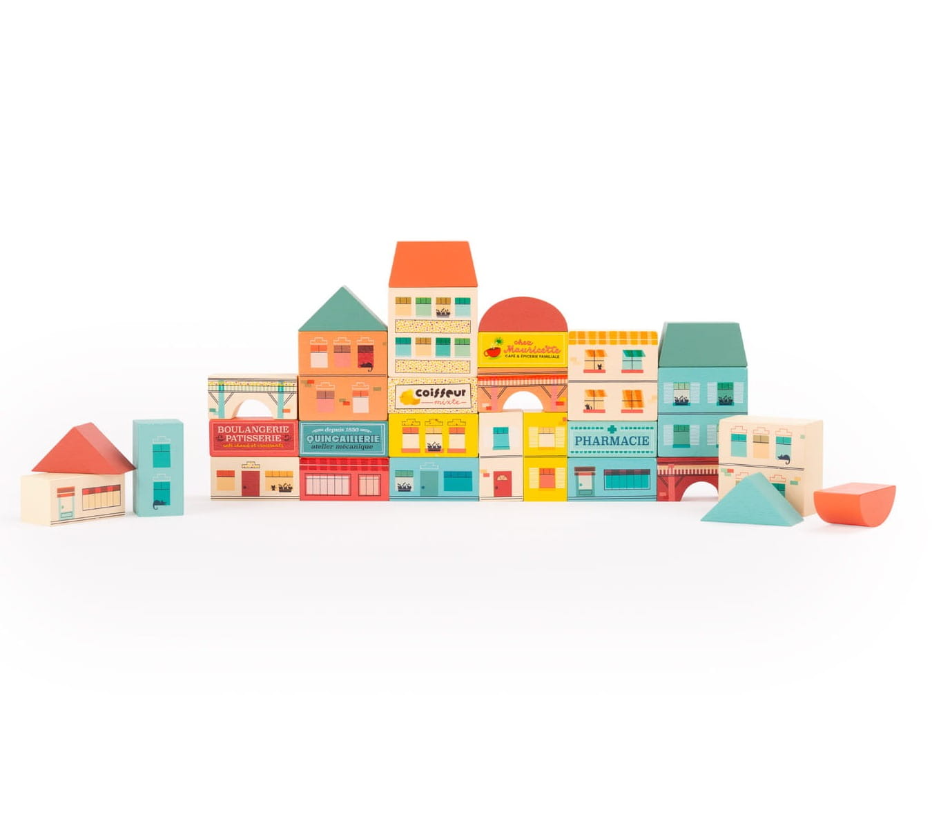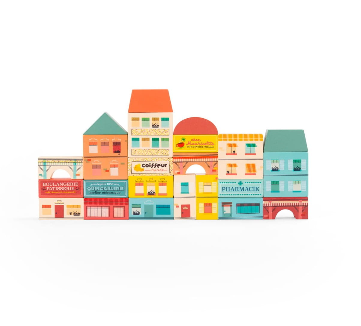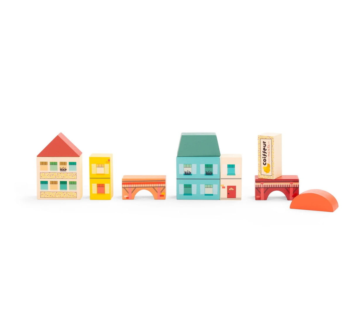 Ilustrowane klocki z kolekcji Avenue du Moulin gwarantują niekończącą się zabawę w architekta. Poszczególne elementy można dowolnie układać jeden na drugim, tak aby stworzyć swoje wymarzone miasteczko, w którym rozpoczyna się nowy dzień.