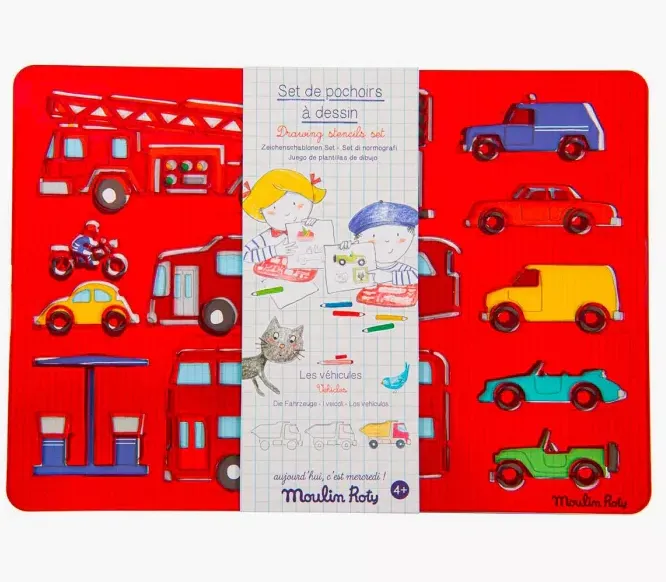 Zestaw 2 szablonów do odrysowywania różnych pojazdów. Szablon wykonany jest z plastiku, który można poddać recyklingowi. Zmywalna powierzchnia.