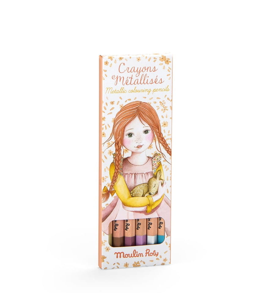 Zestaw 6-ciu kredek z metalicznym połyskiem z kolekcji Les Rosalies. Zapakowane w pięknie ilustrowanie pudełko z wizerunkiem uroczej lalki w warkoczach, trzymającej małego jelonka.