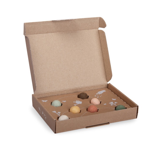 Zestaw 7 kul z nasionami pozwalający wyhodować piękne polne kwiaty w ogrodzie. Najlepiej wysiewać je w kwietniu lub maju - to idealny czas, aby cieszyć się nimi tak długo, jak to możliwe. Kule wykonane są z gliny, w której umieszczone są nasionka. Kwiaty będą się cieszyć powodzeniem wśród pszczół, motyli i innych zapylaczy.