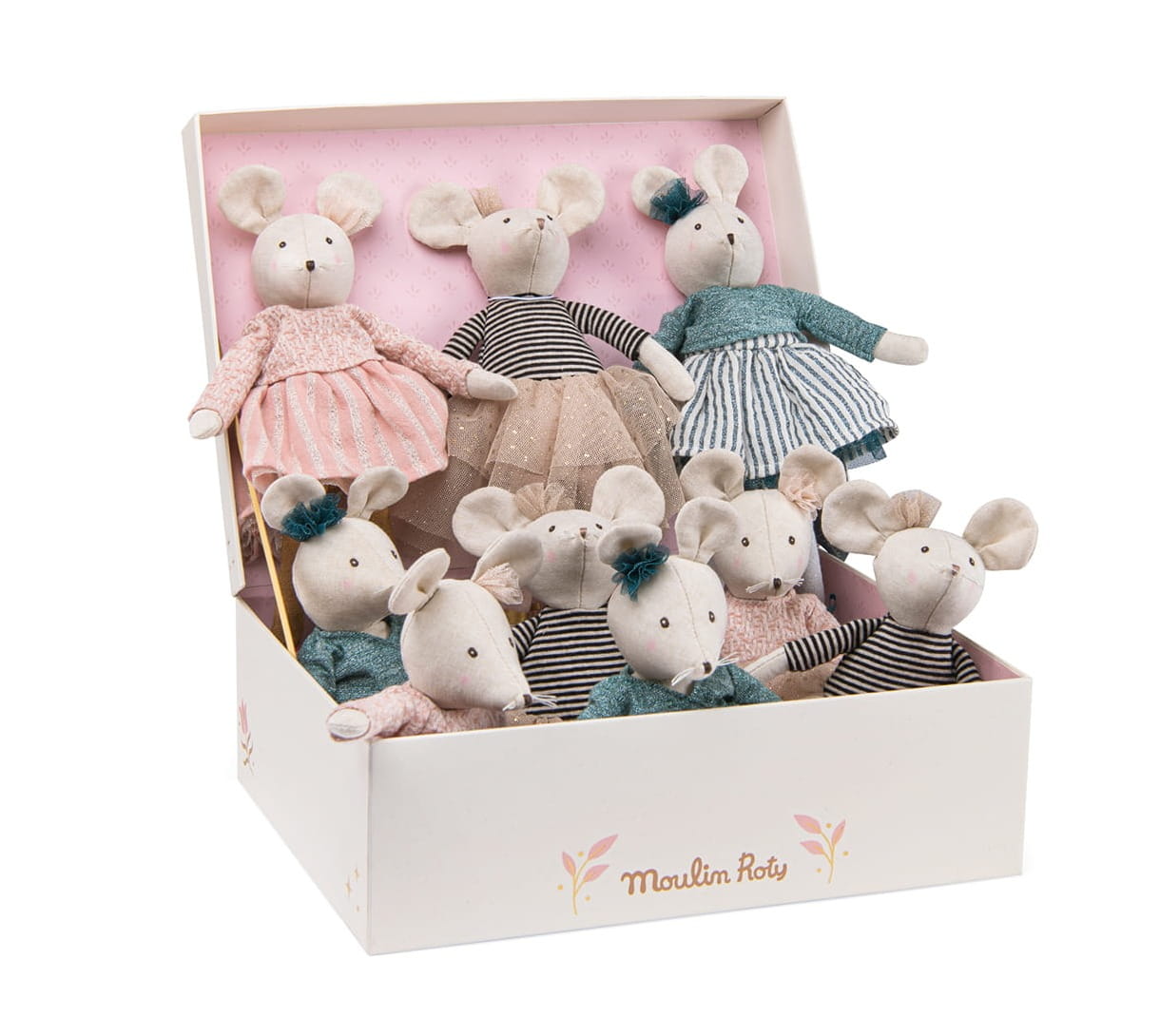 Zestaw 9 pluszowych lalek myszek francuskiej marki Moulin Roty. Myszki ubrane