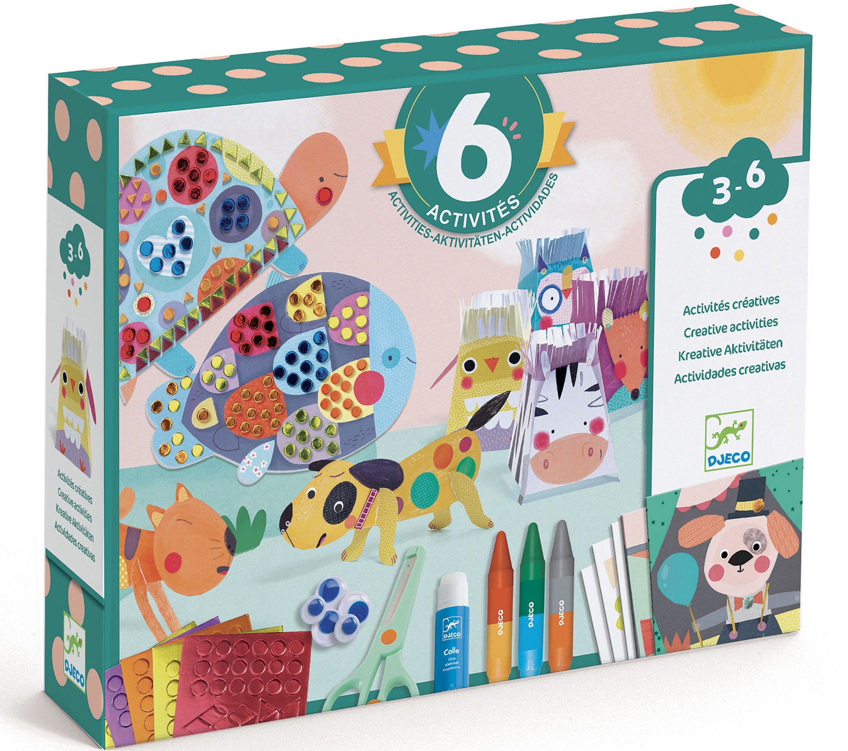 Artystyczna propozycja dla dzieci w wieku 3-6 lat. Kreatywny zestaw "Zwierzęta i ich domki" to 6 aktywności takich jak kolaż, kolorowanie, mozaiki... Każdy znajdzie coś dla siebie! Długie godziny artystycznych zajęć przybliżające różne kreatywne metody tworzenia rysunków. Wszystkie niezbędne akcesoria są zawarte w zestawie. Materiały cechują się wysoką jakością.
