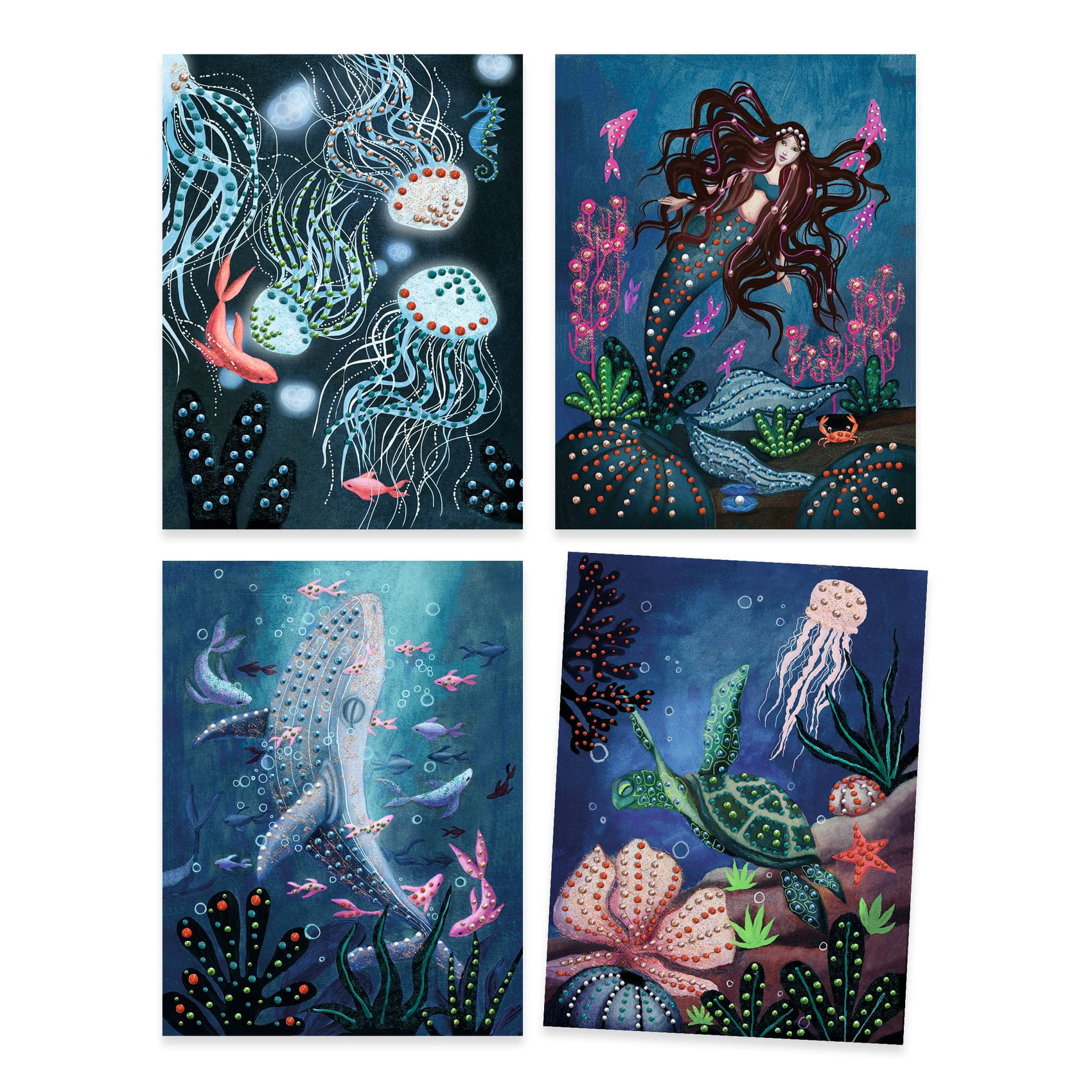 Zestaw artystyczny składający się z 4 zachwycających obrazów do ozdobienia dający efekt 3D. Rysunki przedstawiają życie toczące się w oceanie: majestatycznego wieloryba, radośnie pływającego żółwia, tajemniczą syrenę i roztańczone meduzy. Obrazy przyciągają uwagę nasyconymi odcienami granatu i niebieskiego, oddając głębię podwodnego świata.