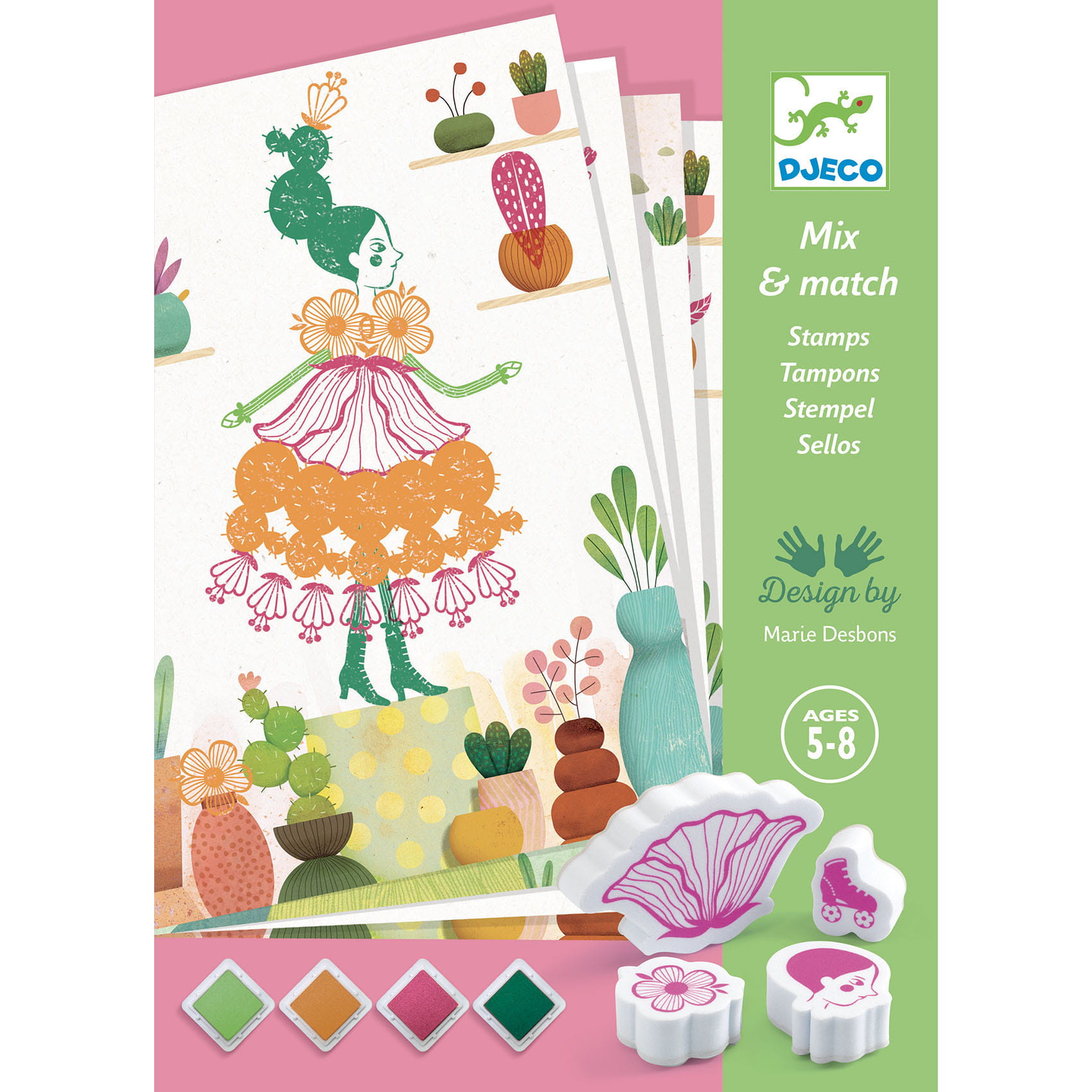 Zestaw artystyczny z pieczątkami, z których dziecko komponuje własne postacie. Łącząc kształty i różne kolory, tworzy śliczne, kwieciste stroje.
