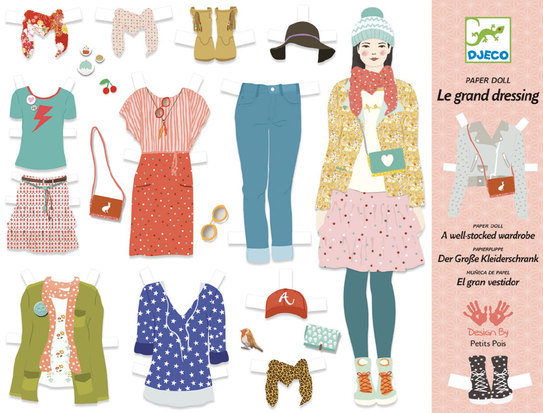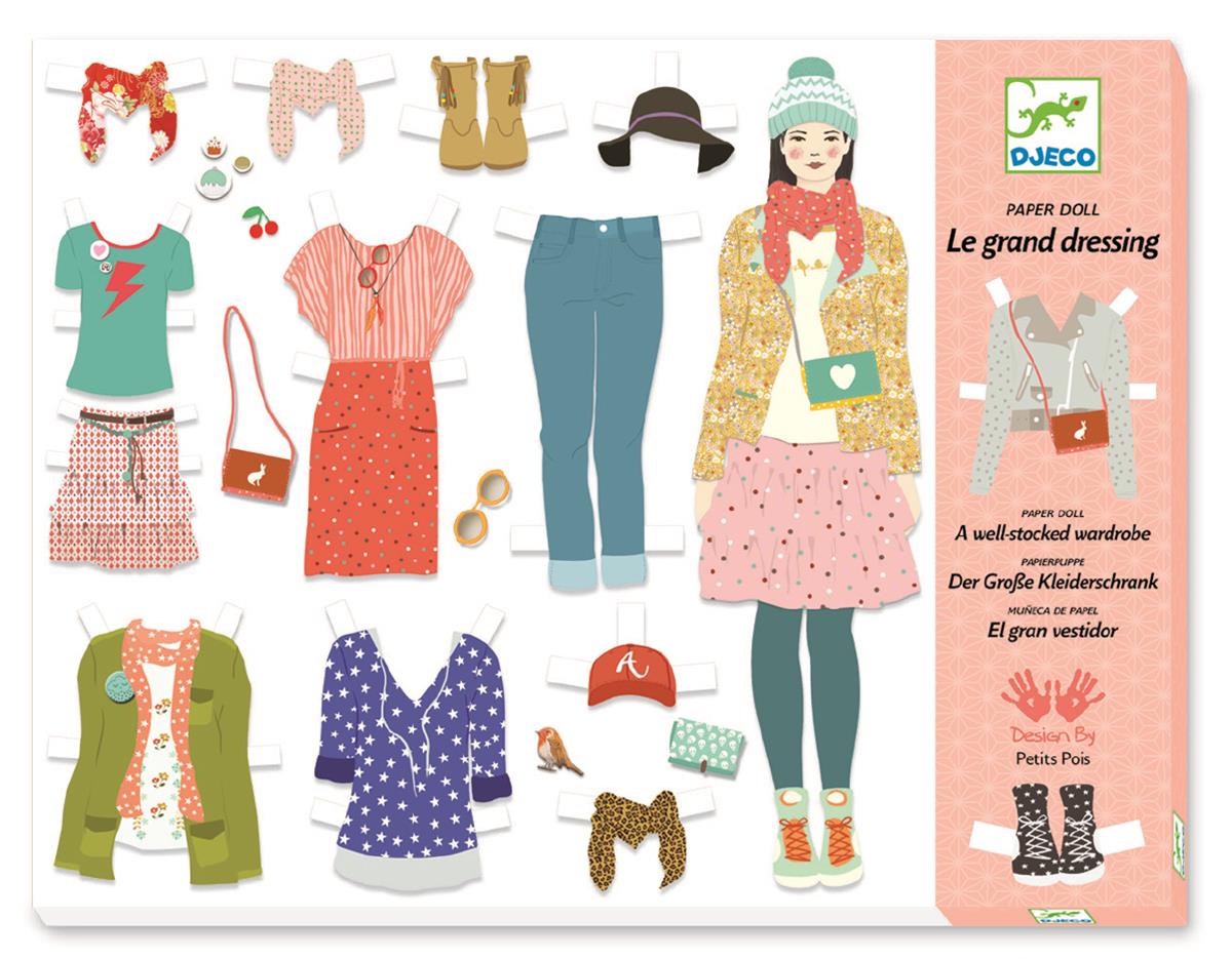 Zestaw obejmuje 3 małe dziewczynki wykonane z grubego kartonu, w dużym pudełku, z przegródkami do przechowywania wielu ubrań.