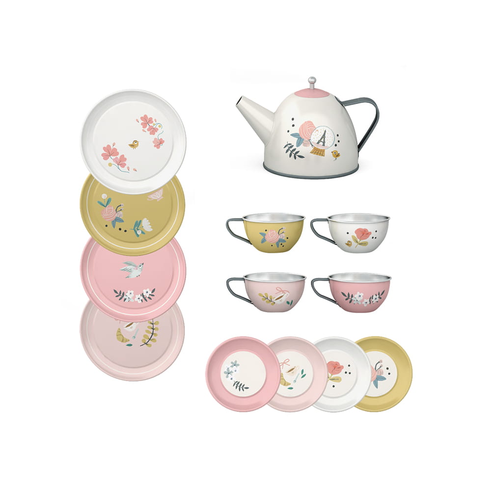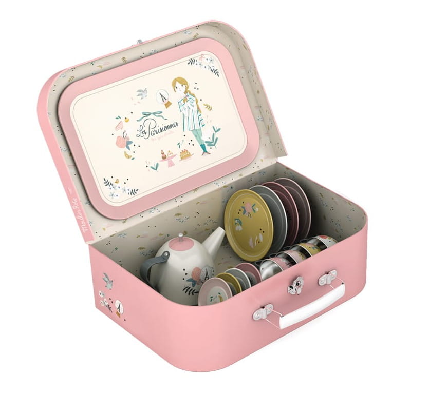 Zestaw do serwowania herbaty z kolekcji Les Parisiennes przyda się na każdym przyjęciu dla lalek. Łatwy do transportu - zapakowany w uroczą i praktyczną walizkę z zatrzaskiem i uchwytem, która cudownie ozdobi dziecięcy pokój. Zastawa składa się z czajnika, tacy, 4 dużych talerzy i 4 filiżanek z 4 podstawkami. Wszystkie elementy są ozdobione delikatnymi wzorami w dopasowanych pastelowych kolorach.