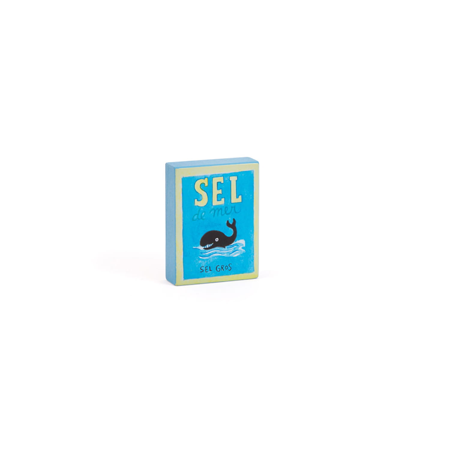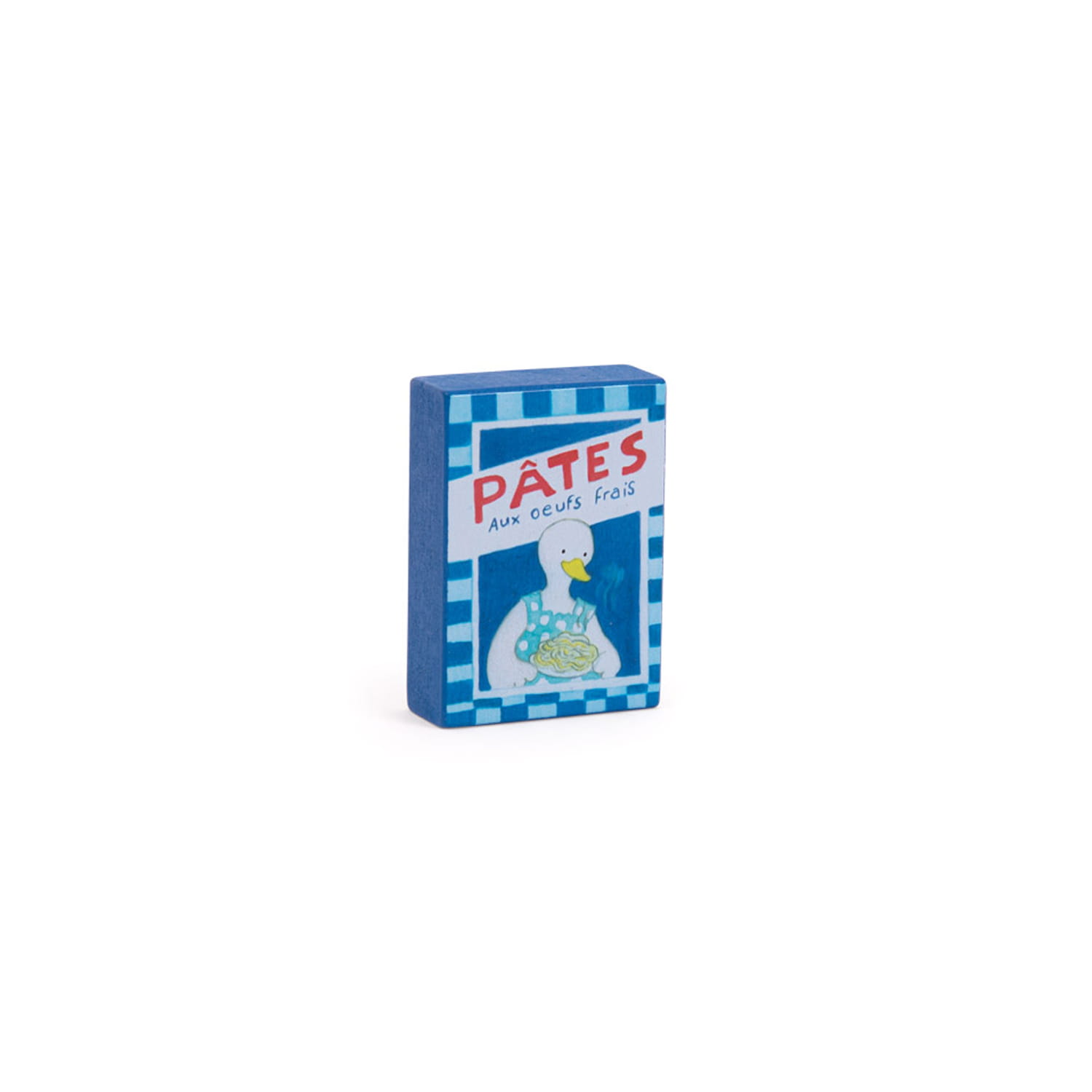 Drewniana skrzyneczka z 7 produktami spozywczymi - czekoladą, sardynkami w puszce, herbatnikami, kawą zbożową i innymi.