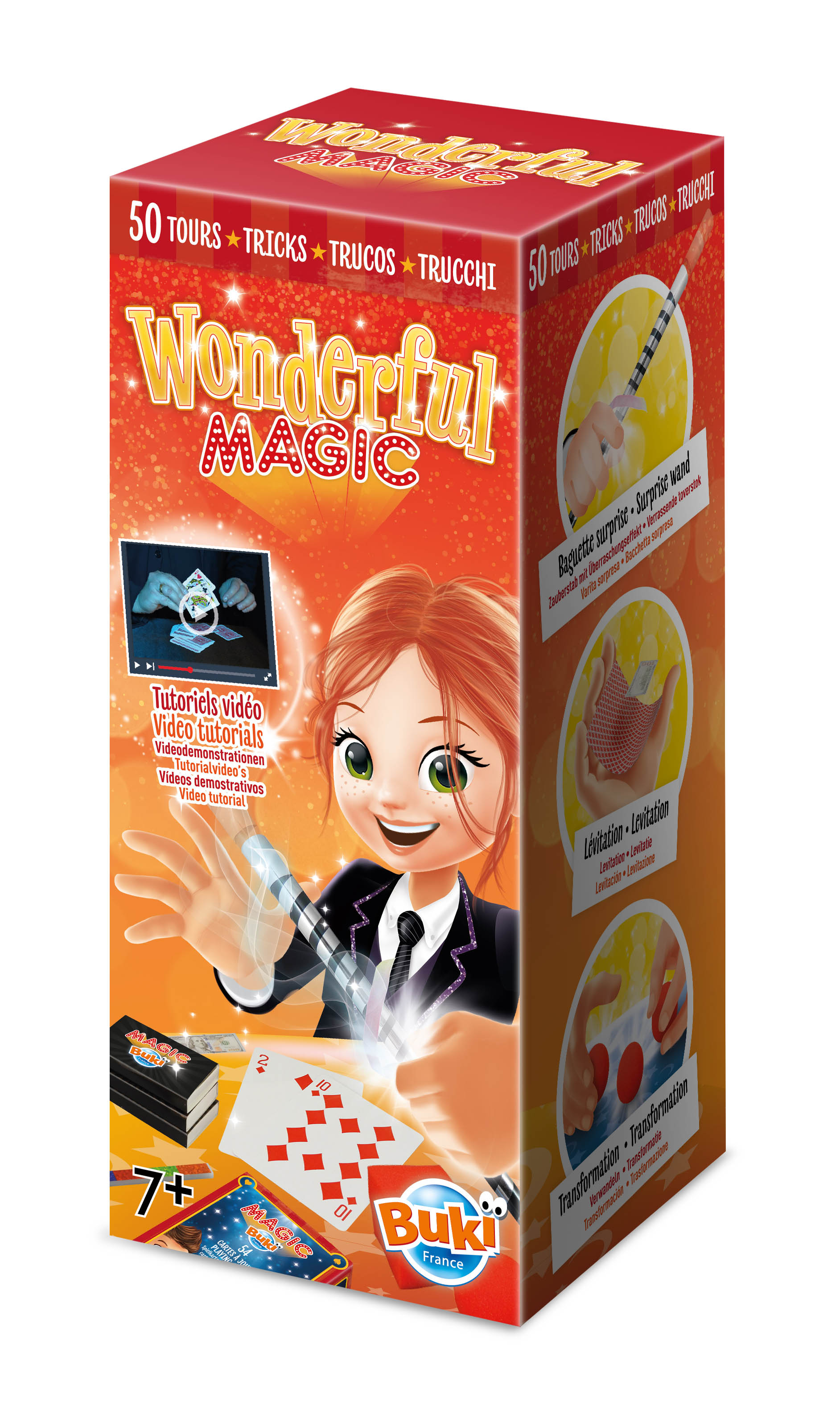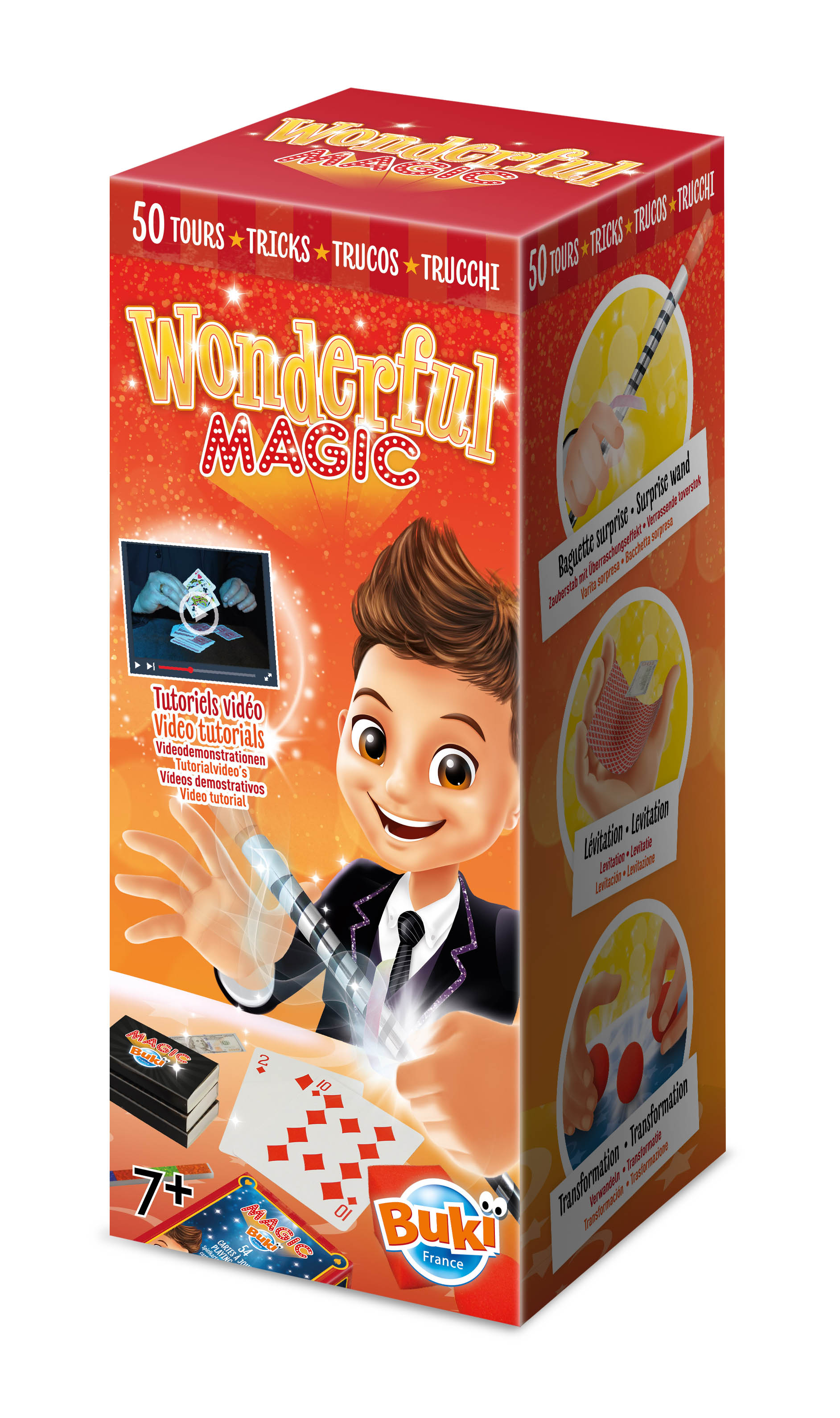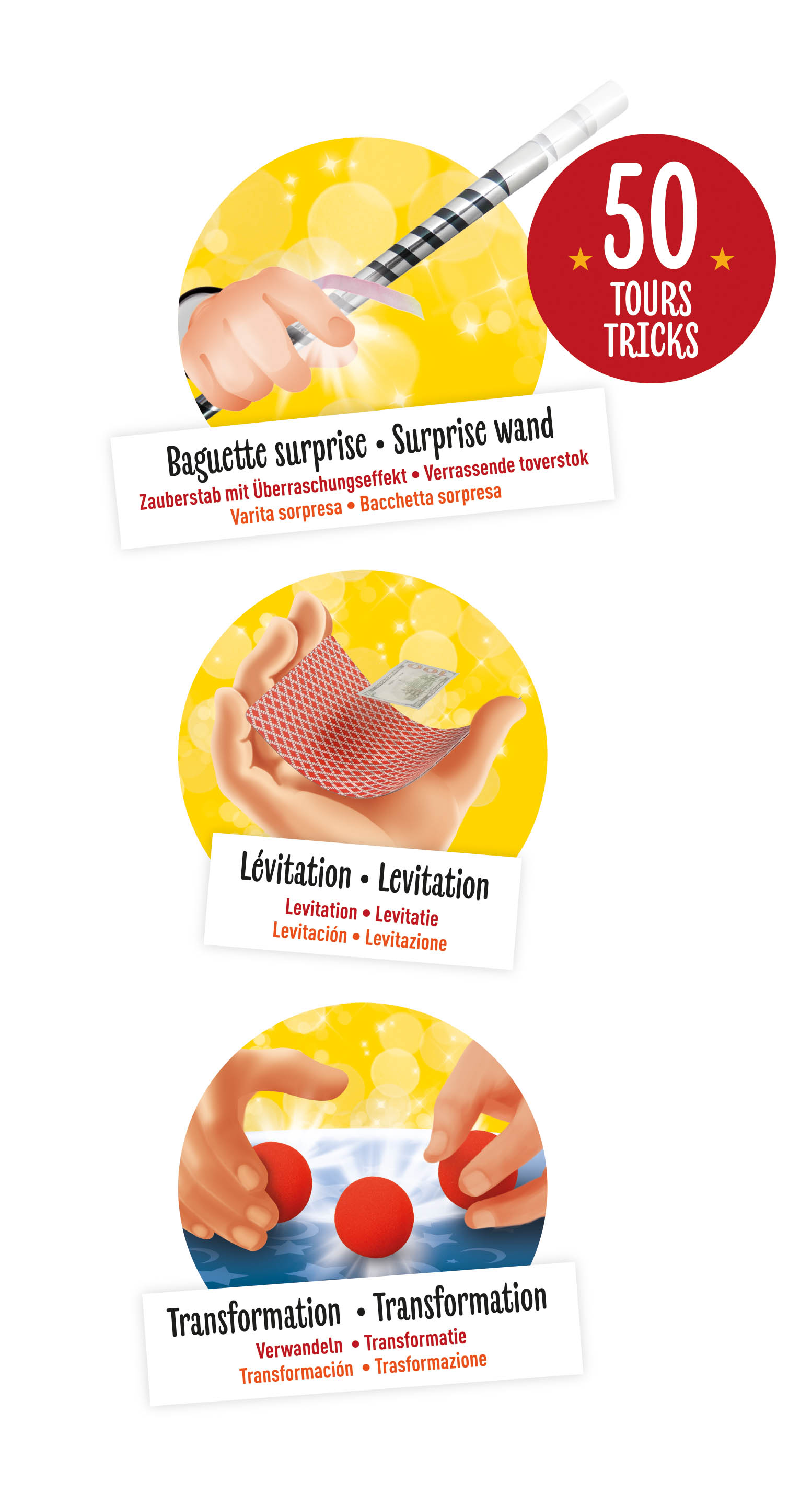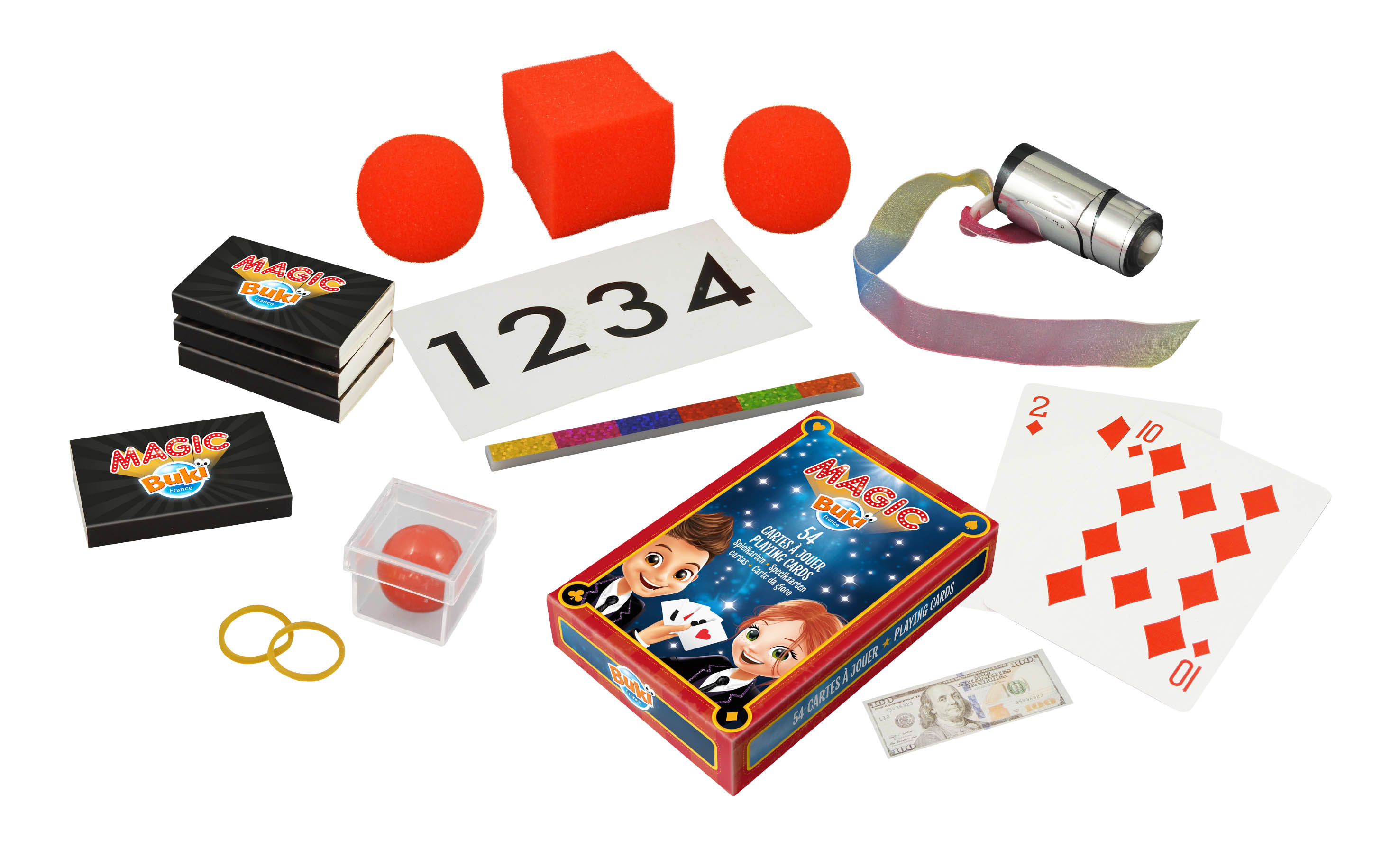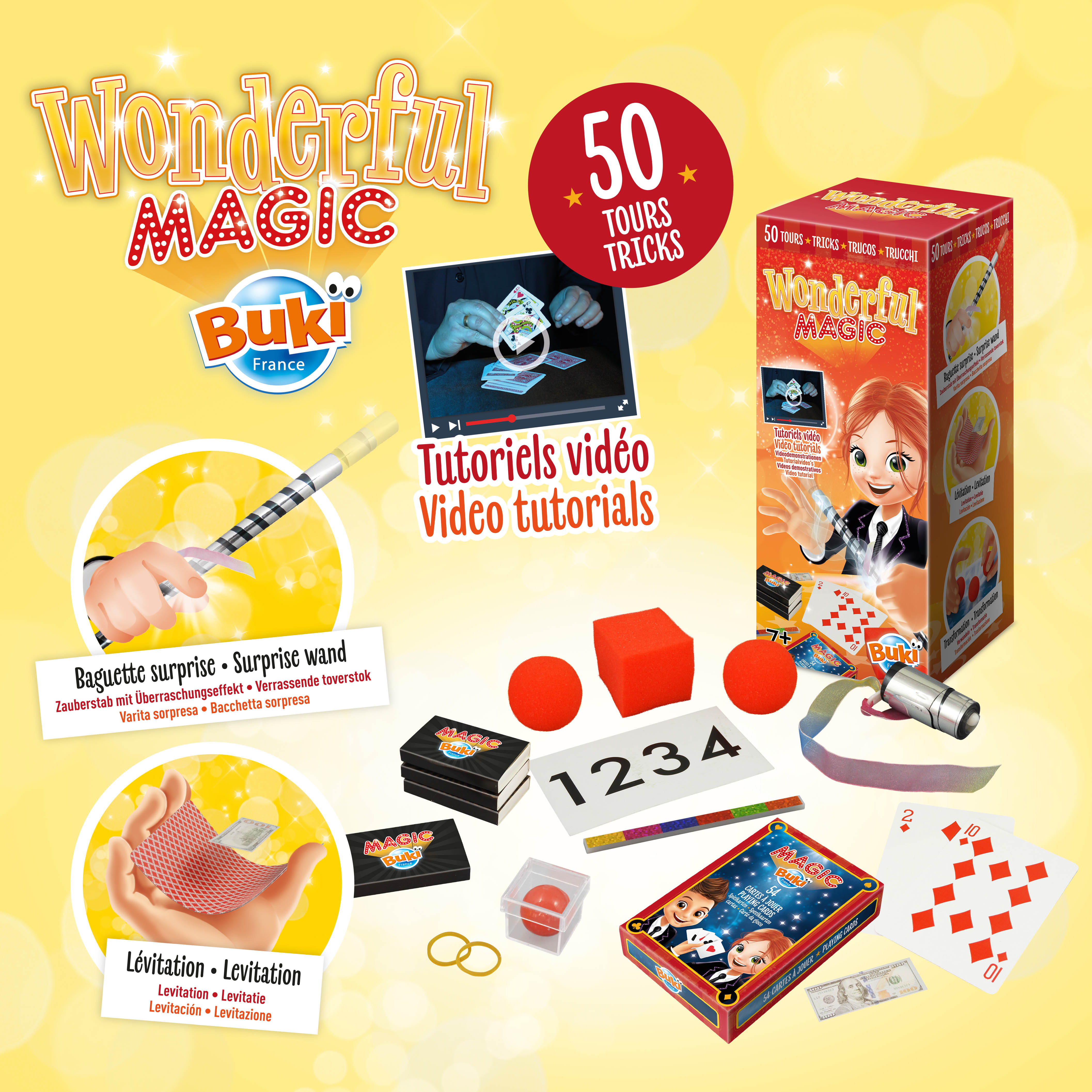 Zestaw zawiera różne akcesoria do przeprowadzenia kultowych sztuczek: talię kart, tęczowy patyczek, lewitującą kartę itp. Zaskocz widzów różdżką z niespodzianką lub kulkami z pianki.