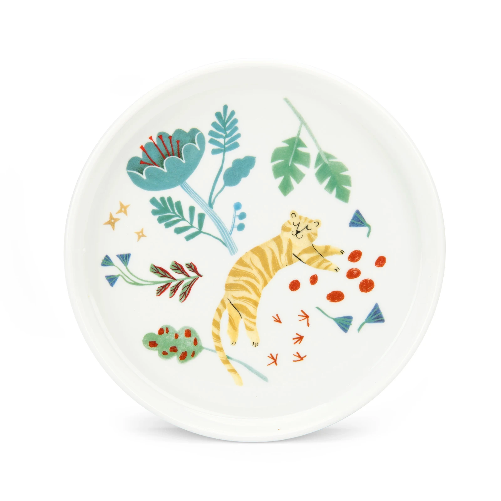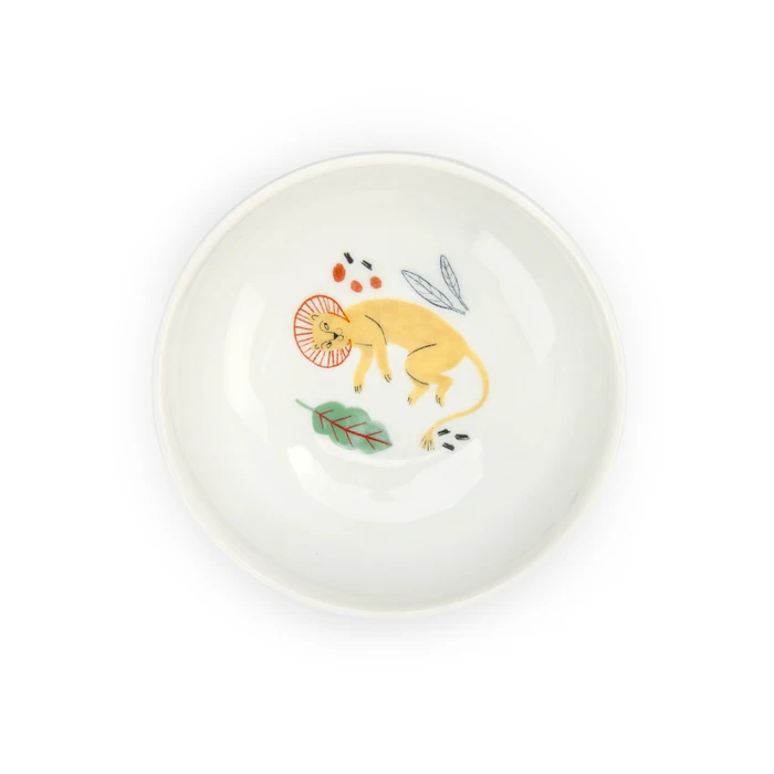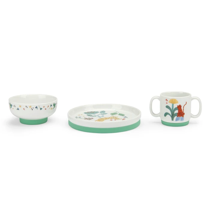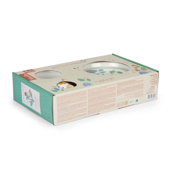 Porcelanowy zestaw naczyń dla dzieci jest ozdobiony ilustracjami z kolekcji La Foret Mawa. Zestaw zawiera kubek z dwoma uchwytami, miseczkę i talerz, wszystkie z antypoślizgowymi podstawkami, dzięki czemu są łatwe w użyciu dla najmłodszych. Naczynia można używać w kuchence mikrofalowej i myć w zmywarce. Zapakowane w prezentowe pudełko.