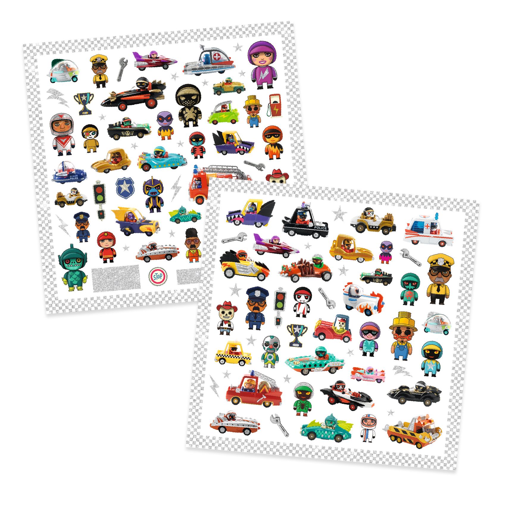 Zestaw 160 naklejek dla dzieci inspirowanych serią autek Crazy Motors od Djeco! Znani i lubiani kierowcy rajdowi oraz ich samochody chętnie ozdobią rysunki i zeszyty. Metaliczne elementy na naklejkach dodają im atrakcyjności. W zestawie znajdują się dwa arkusze, każdy w dwóch kopiach, aby móc ponownie użyć naklejek ze swoimi ulubionymi bohaterami.