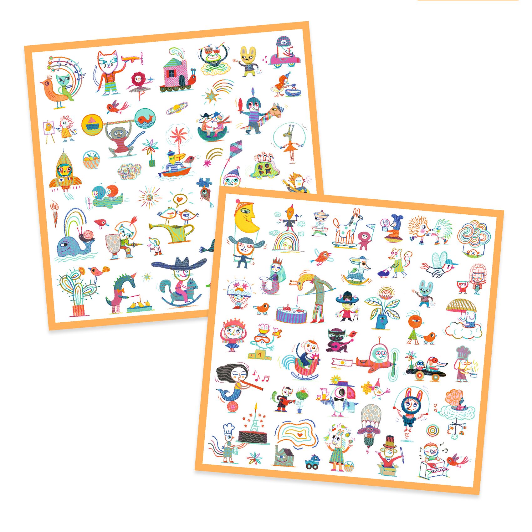 Zestaw 160 naklejek dla dzieci z motywem postaci występujących na grafikach Djeco. Króliczki, ptaszki, króliczki i inne chętnie ozdobią rysunki oraz zeszyty. Autorką grafik jest uznana ilustratorka Muriel Kerba. W zestawie znajdują się dwa arkusze, każdy w dwóch kopiach, aby móc ponownie użyć naklejek ze swoimi ulubionymi bohaterami.