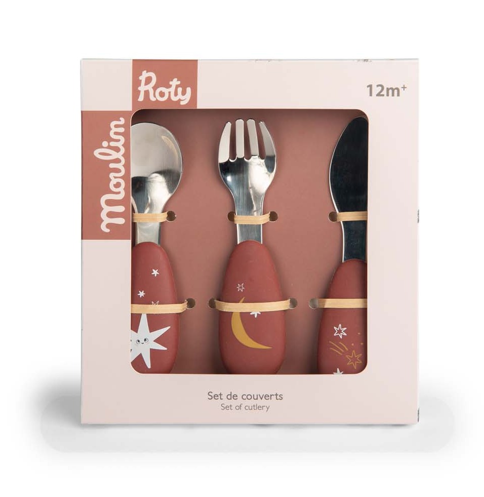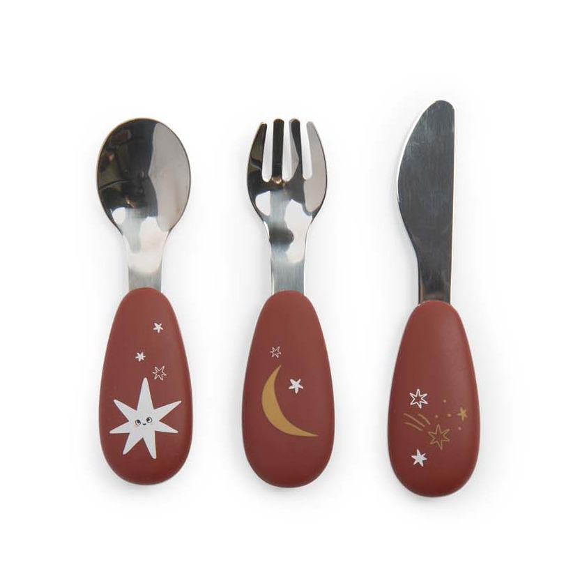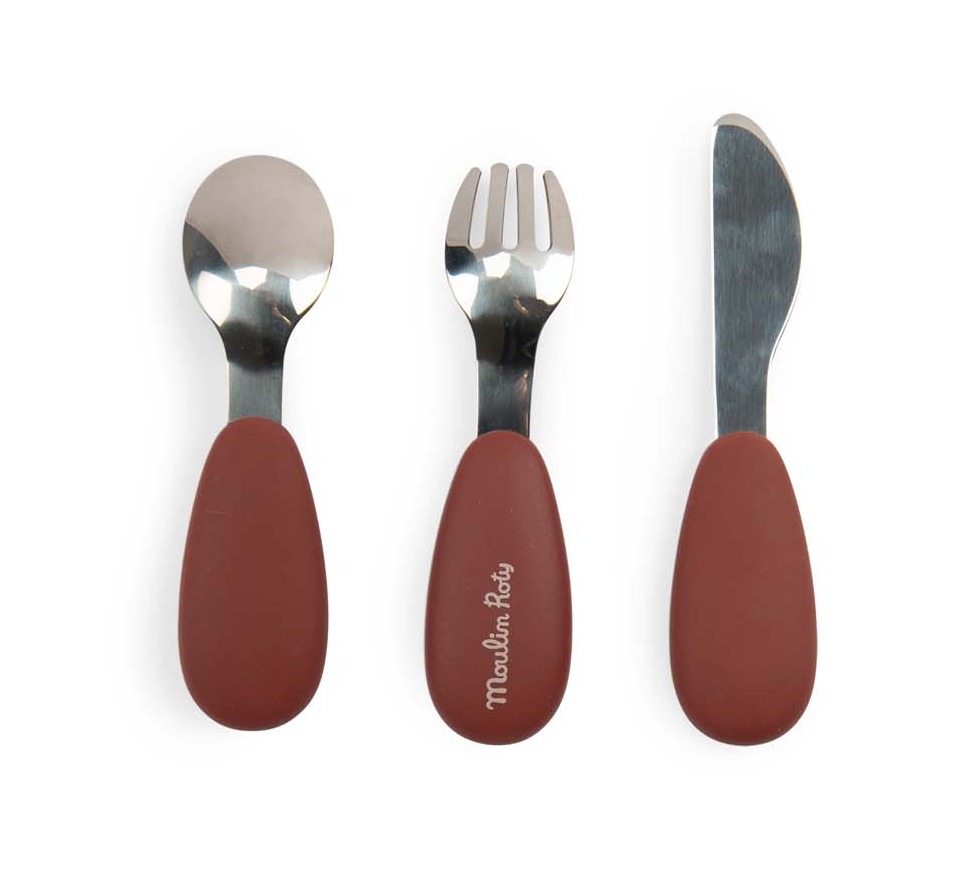 Zestaw sztućców dla dzieci ilustrowanych grafikami pochodzącymi z kolekcji Après la pluie. Widelec, łyżka i nóż wykonane są ze stali nierdzewnej, która jest materiałem bezpiecznym w kontakcie z żywnością. Silikonowe rączki zapewnią dziecku pewny chwyt.