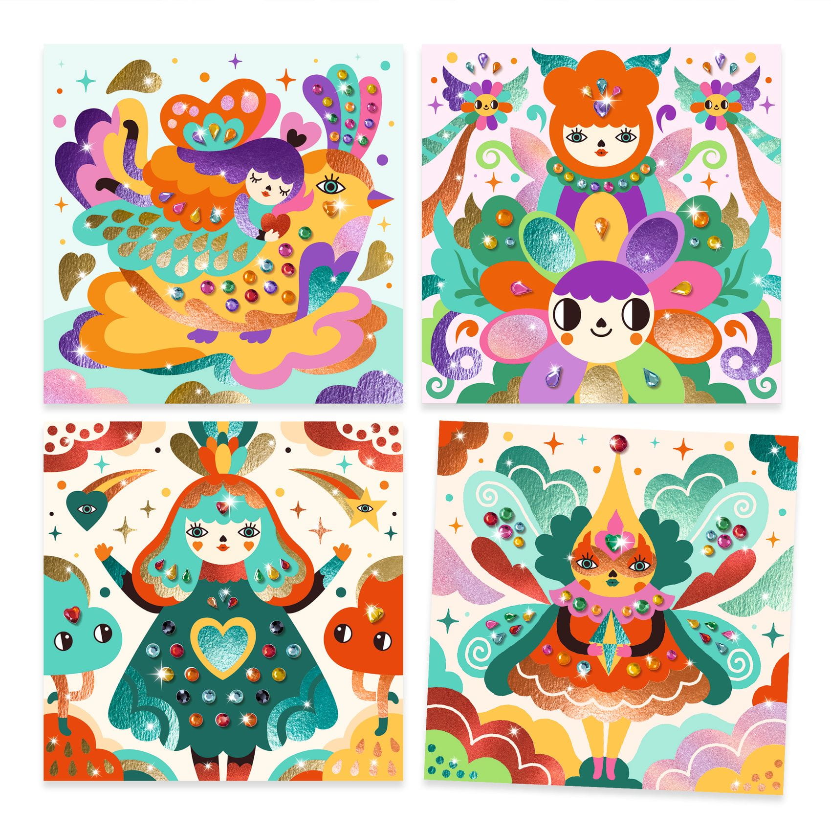 Zawartość: 4 ilustrowane karty pokryte klejącą nawierzchnią (20 x 20 cm), 1 zestaw kolorowej folii do przyklejenia, 33 mieniące się diamenciki do przyklejenia, 1 plastikowe narzędzie zaprojektowane specjalnie przez Djeco do odkrywania klejących powierzchni, instrukcja krok po kroku