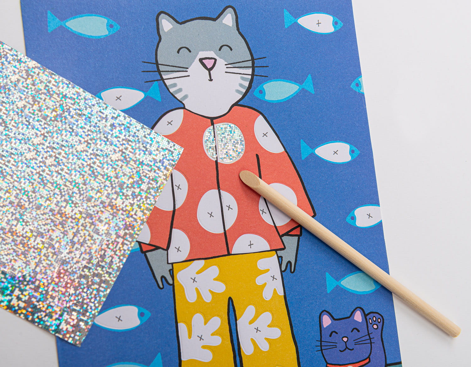 Zwierzątka z kolekcji Les Loufoques czekają na ozdobienie za pomocą folii transferowej. Wesołe ilustracje przedstawiające zabawnego kotka, krokodyla itd. posiadają specjalnie wydzielone miejsca do wykończenia. Należy wybrać motyw i kolorowy arkusz, a następnie odklejać pojedynczo białe pola na obrazku. Po umieszczeniu na wybranym obszarze arkusza, należy delikatnie potrzeć miejsce załączonym drewnianym patyczkiem. Po usunięciu folii, obrazek krok po kroku będzie nabierał kształtu.
